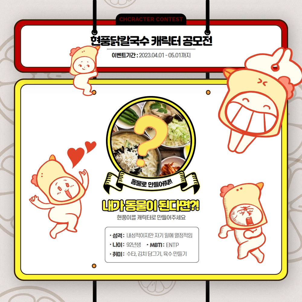 - 현풍닭칼국수와 관련이 있는 모든 대상의 캐릭터화 (로고, 브랜드 이미지, 메뉴 등등)