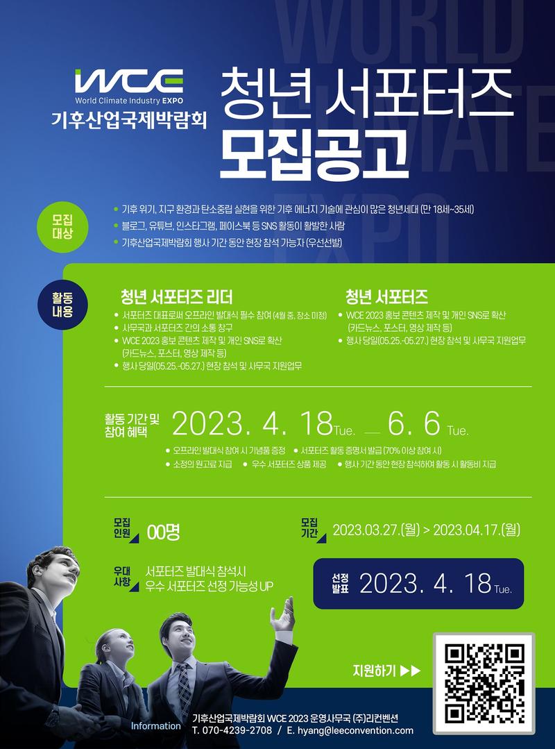 ○ 활동 개요 ⏵활동 기간 - 2023.04.18.(화)\~2023.06.06.(화) ⏵활동 내용 1) 청년 서포터즈 리더 - 서포터즈 대표로써 오프라인 발대식 필수 참여 - 사무국과 서포터즈 간의 소통 창구 - WCE 2023 홍보 콘텐츠 제작 및 개인 SNS로 확산 (카드뉴스, 포스터, 영상 제작 등) - 행사 당일(05.25.-05.27.) 현장 참석 및 사무국 지원업무 2) 청년 서포터즈 - WCE 2023 홍보 콘텐츠 제작 및 개인 SNS로 확산 (카드뉴스, 포스터, 영상 제작 등) - 행사 당일(05.25.-05.27.) 현장 참석 및 사무국 지원업무 ⏵ 모집인원 - 00명 ⏵ 모집기간 - 2023.03.27.(월) \~ 2023.04.17.(월) 까지 ⏵ 우대사항 - 서포터즈 발대식 참석 시 우수 서포터즈 선정 가능성 UP ⏵ 선정발표 - 2023.04.18.(화) ○ 참여 혜택 - 오프라인 발대식 참여 시 위촉장 및 기념품 증정 - 서포터즈 활동 증명서 발급 (70% 이상 참여 시) - 소정의 원고료 지급 - 우수 서포터즈 상품 제공 - 행사 기간 동안 현장 참석하여 활동 시 활동비 지급 (3일 활동) ○ 지원링크 - https://naver.me/59N9MsML ○ 홈페이지 - 검색: WCE 2023 - 주소: http://www.wce.or.kr/2023/main/index_kor.asp ○ 문의처 기후산업국제박람회 WCE 2023 운영사무국 (주)리컨벤션 T. 070-4239-2708 E. hyang@leeconvention.com *모집 일정 및 활동 내용은 사정에 따라 변경될 수 있습니다.