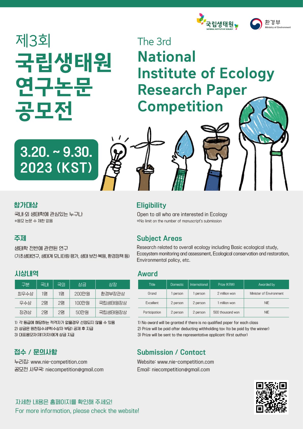 | Title | @cols=2:Number of Person | Prize (KRW) | Awarded by | | ----- | ---------------- | ---------------- | ----------- | ---------- | | Domestic | International | | Grand | 1 person | 1 person | 2 million won | Minister of Environment | | Excellent | 2 person | 2 person | 1 million won | NIE | | Participation | 2 person | 2 person | 500 thousand won | NIE |