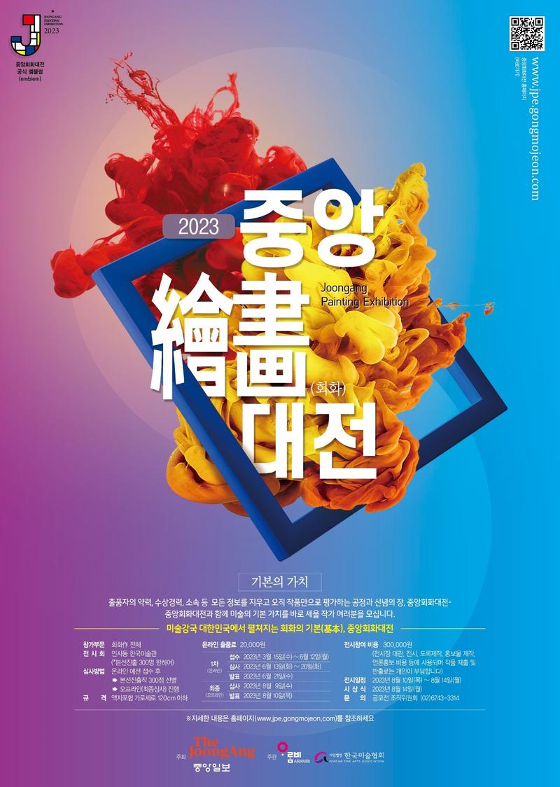 중앙회화대전 : 2023, 기본의 가치 미술강국 대한민국에서 펼쳐지는 회화의 기본(基本), 중앙 회화대전 중앙회화대전을 통해 재야에 숨어있던 대한민국 미술 신인들이 발굴되고 있습니다. 회화의 기본을 지키는 중앙회화대전의 신념 덕일 것입니다. 중앙회화대전은 오직 ‘작품’으로만 ‘작품’을 바라봅니다. 작품 외에 어떠한 정보도 바라지 않습니다. 중앙회화대전이 믿는 ‘기본의 가치’는 바로 여러분이기 때문입니다. 중앙회화대전과 함께 미술의 기본 가치를 바로 세울 작가들을 모십니다.