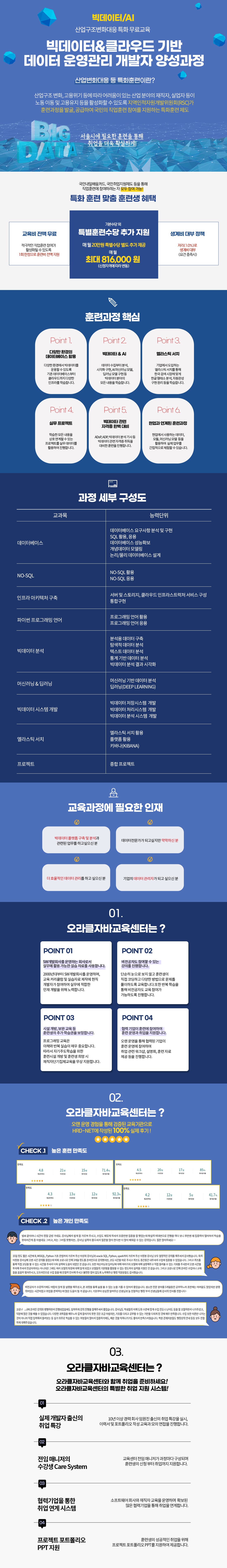 2023년 SW융합 산업구조 변화대응 특화훈련 빅데이터&클라우드 기반 데이터 운영관리 개발자 양성과정 ▶ 교육 목표 - 업무 요구사항을 달성하기 위하여 전사 데이터 아키텍처 정책과 원칙을 기반으로 데이터베이스를 설계, 구축하고 성능을 관리할 수 있다. - 다양한 형태의 대용량 데이터 집합으로부터 유용한 정보를 찾고 예측하기 위해 목적에 적합한 분석 기술과 방법을 적용하여 데이터에 대한 전처리, 탐색, 분석 모델링, 시각화를 수행할 수 있다. - 비관계형 데이터베이스를 이해하고 활용할 수 있으며 빅데이터 최적화 운영과 관리를 위한 튜닝, 백업 등 다양한 기술을 학습할 있다. - 애플리케이션 서비스 제공을 위한 각 환경별 서버, 스토리지, 인프라스트럭쳐를 구성하고 서비스를 통합 구현할 수 있다. - 다양한 형식의 대용량 데이터를 저장, 처리, 분석하기 위한 인프라, 인터페이스 및 솔루션을 개발하고 적용할 수 있다. - 딥러닝을 위한 기초 함수 및 필요 모듈을 활용할 수 있으며 신경망을 이해하고 주어진 문제에 가설을 설정하여 CNN, RNN 등 딥러닝 기법을 구현할 수 있다. - 한글 검색에 특화된 엘라스틴 서치를 이해하고 엘라스틴 서치의 다양한 기능을 활용하여 데이터를 운영할 수 있다. ▶ 교육개요 다양한 환경에서 가장 효율적인 빅데이터 구현을 위해 관계형 데이터베이스와 비관계형 데이터베이스, 클라우드 환경 등 다양한 데이터 적재 인프라를 학습하며 이를 기반으로 빅데이터 시스템을 개발하는 방법과 빅데이터 분석, 시각화 및 머신러닝, 딥러닝 등 인공지능 모델을 학습합니다. 학습한 내용을 토대로 인프라 기획부터 분석, 모델 구현을 할 수 있는 데이터 운영관리 개발자로 양성될 수 있습니다. ▶ 교육기간 및 일정
