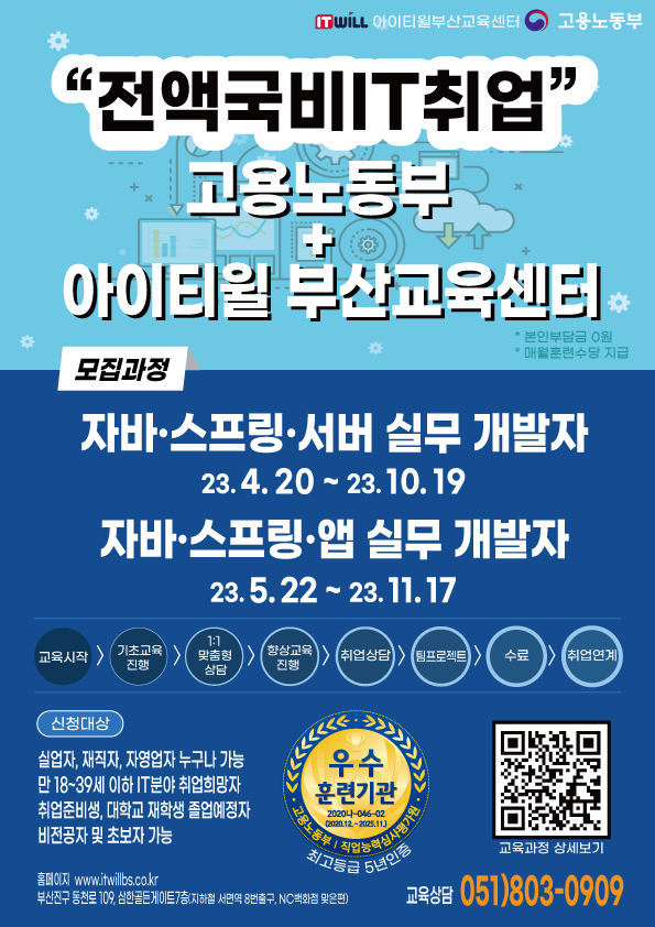 ■ 교육내용 * 자바·스프링·서버 개발자 - JAVA / JSP / JSP Model2 - 클라우드 서버(리눅스, AWS) - Framework (Spring\,MyBATIS) - Web표준(HTML5,CSS3,jQuery) - 데이터베이스 활용 - 실무 프로젝트 대회 * 자바·스프링·앱 개발자 - JAVA / JSP / JSP Model2 - 모바일 앱(Android) - Framework (Spring\,MyBATIS) - Web표준(HTML5,CSS3,Javascript) - 데이터베이스 활용 - 실무 프로젝트 대회 ■ 모집인원 : 각 30명 ■ 교육대상 실업자, 재직자, 자영업자 누구나 가능 만 18세 \~ 39세 이하 IT분야 취업 희망자 취업준비생, 대학교 재학생 및 졸업예정자 비전공자 또는 초보자 가능 ■ 교육비용 전액 국비무료(교재비 포함) 훈련수당 매월 지급 ■ 구비서류 : 신분증 ■ 신청절차 신청서 작성 → 고용센터 방문(내일배움카드 신청) → 교육시작 ※ 조기 마감 될 수 있으니 서두르시길 바랍니다. ■ 교육문의 [대표전화] ☎ 051-803-0909 [홈페이지] www.itwillbs.co.kr