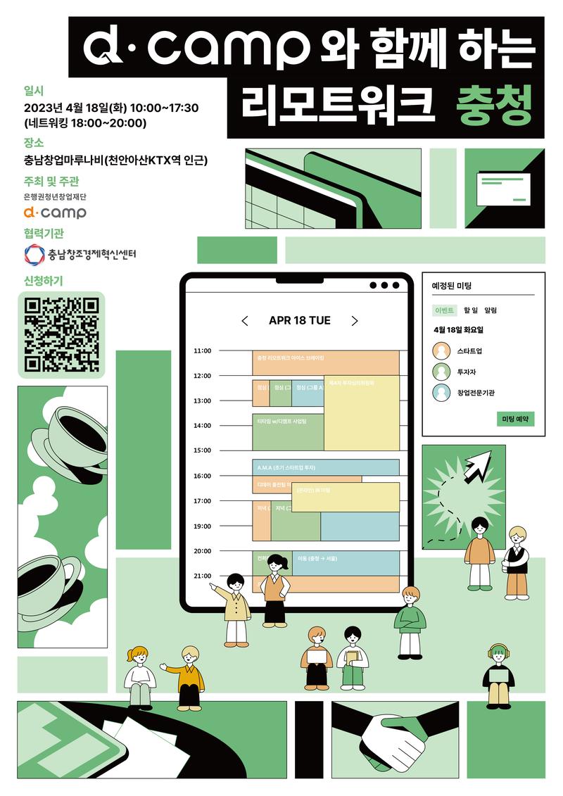 - 장소 \| 충남 창업마루 나비 (충남 천안시 서북구 불당14로 48\, 4\~5층)- 상세내용 \| https://dcamp.kr/event/38985 └ 주요 참가자, 타임테이블 등 상세내용은 공고문을