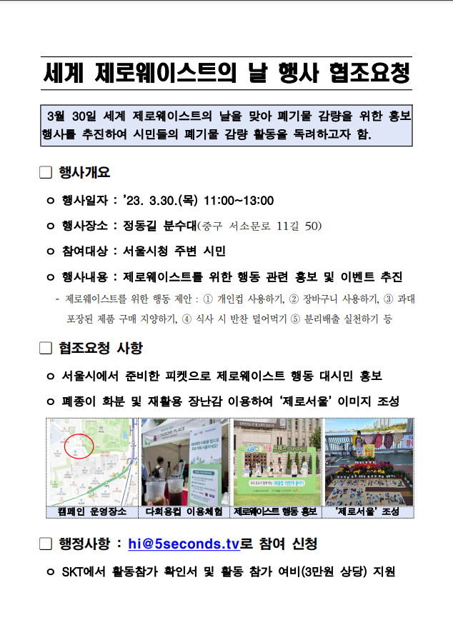 참여 활동: skt 다회용컵 이용체험 안내 / 제로웨이스트 포토존 운영 / 제로웨이스트 피켓 홍보 등