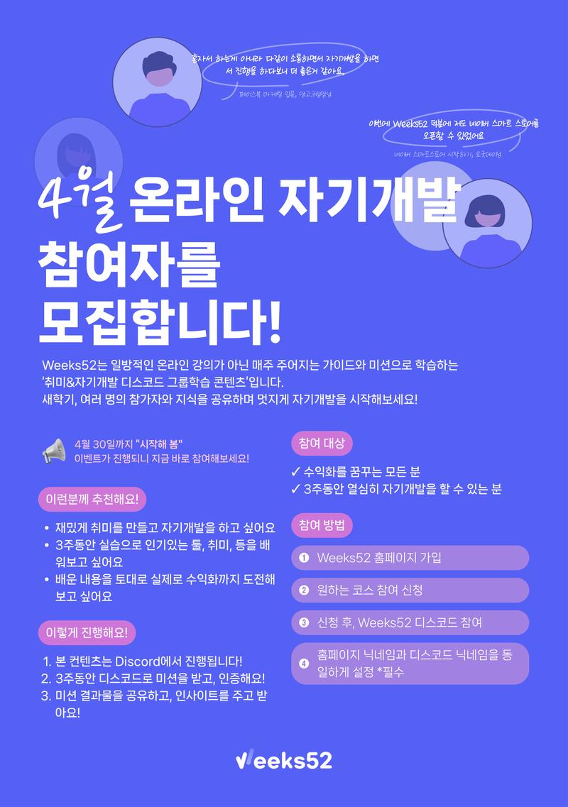 📝 모집 개요 <함께 하는 자기개발 ‘Weeks52’> 4월 온라인 자기개발 참여자를 모집합니다! Weeks52는 일방적인 온라인 강의가 아닌 매주 주어지는 가이드와 미션으로 학습하는 ‘취미&자기개발 디스코드 그룹학습 콘텐츠’입니다. 새학기, 여러 명의 참가자와 지식을 공유하며 멋지게 자기개발을 시작해보세요!