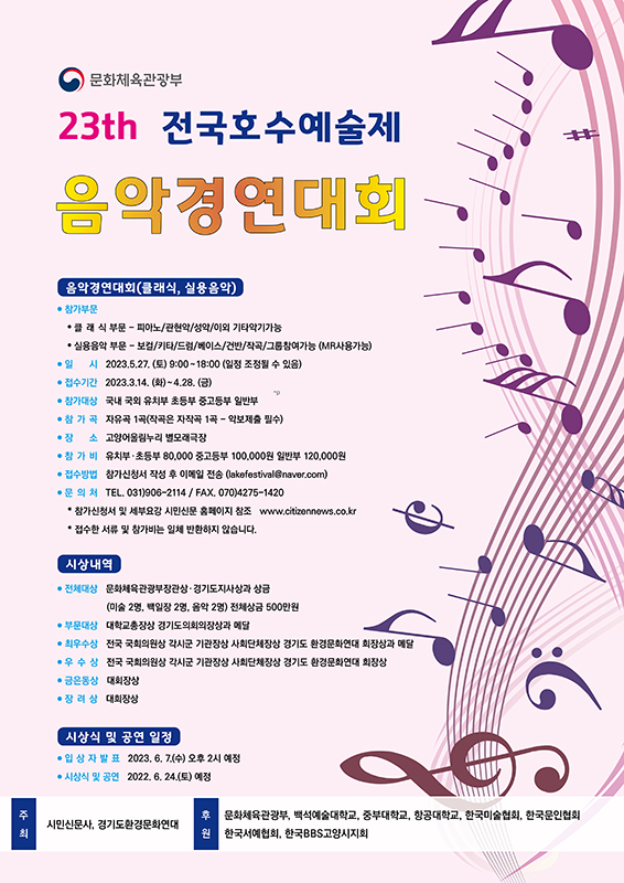 시민신문사에서는 문화 역량 증진과 창의적인 예술적 감성을 진작시키고자 제23회 전국 호수예술제 음악경연대회를 다음과 같이 개최하오니 많은 참여 바랍니다.