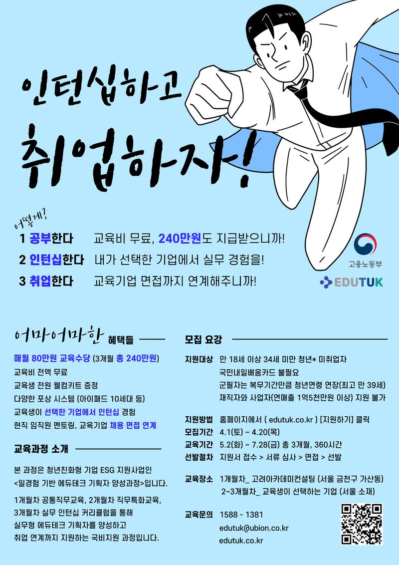 [모집요강] 지원방법 : 홈페이지에서 ( edutuk.co.kr ) [지원하기] 클릭 모집기간 : 4.1(토) \~ 4.20(목) 교육기간 : 5.2(화) \~ 7.28(금) 총 3개월, 360시간 선발절차 : 지원서 접수 > 서류 심사 > 면접 > 선발 교육장소 : 1개월차_ 고려아카데미컨설팅 (서울 금천구 가산동) 2\~3개월차_ 교육생이 선택하는 기업 (서울 소재) 교육문의 : 1588 - 1381 edutuk@ubion.co.kr edutuk.co.kr