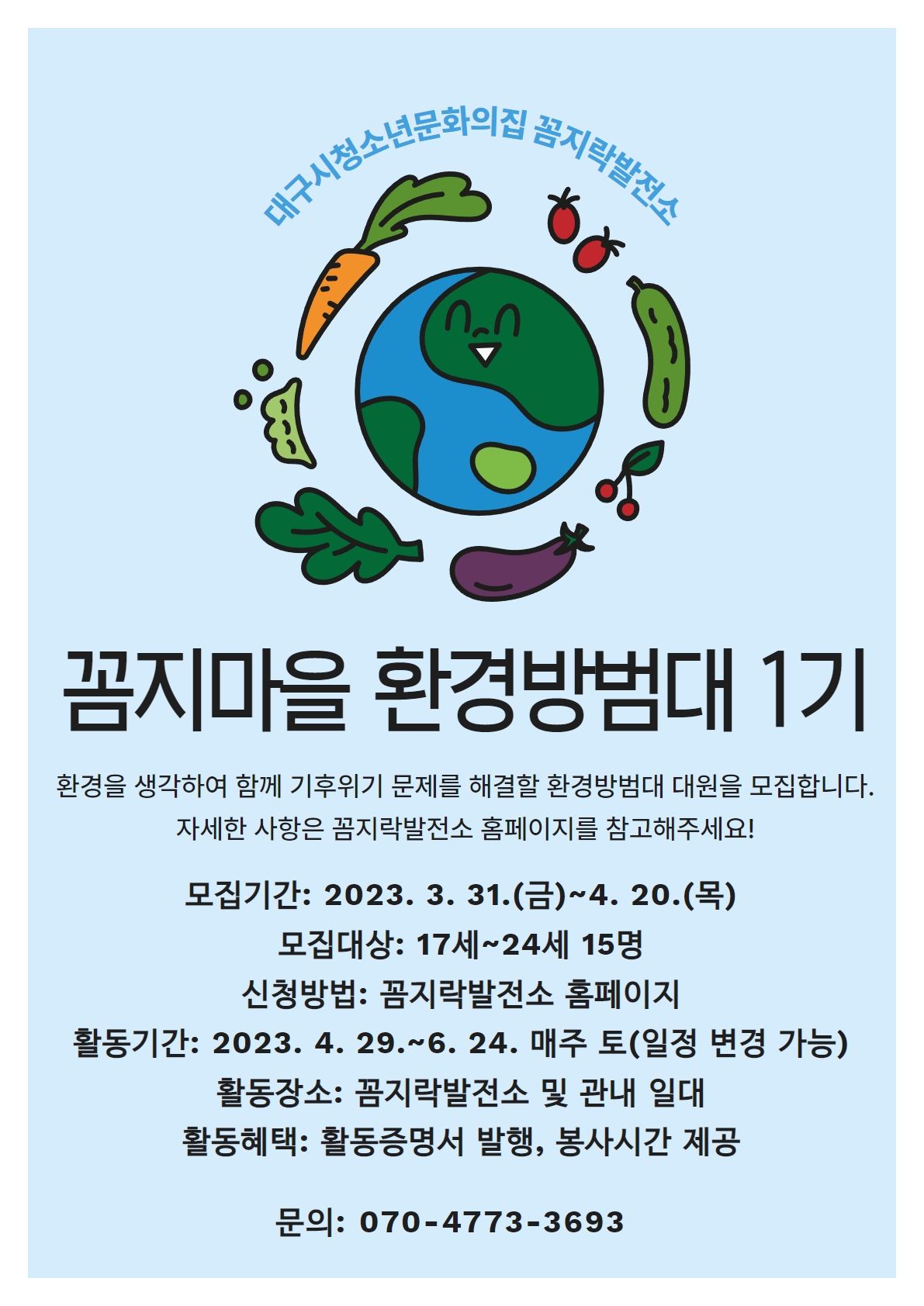 모집기간: 3. 31.(금)\~4. 20.(목) 모집대상: 17세\~24세 15명 신청방법: 꼼지락발전소 홈페이지 활동기간: 4. 29(토)\~6. 24.(토) 매주 (토) 오후 *기관 사정에 따라 상시적 일정 및 시간 변경 가능(사전 공지함) 활동장소: 꼼지락발전소 및 관내 일대 활동혜택: 활동증명서 발행, 봉사시간 제공 선발결과: 4. 21.\~22 중 신청서 서류 심사를 통해 개별 연락함.