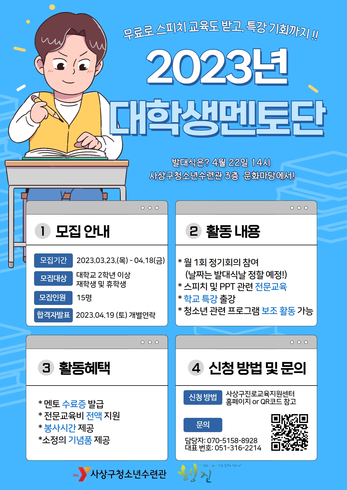 ○ 모집 기간 및 일정 - 모집기간 : 03.23(목)\~04.18(금) - 활동기간 : 5월 \~ 12월 - 합격자 발표 : 4월 19일(토) (*개별연락) 발대식 : 4월 22일 14시 사상구청소년수련관 3층 문화마당 (꼭 참석하셔야 합니다!) ○ 지원자격 : 대학교 2학년 이상 재학생 및 휴학생 (평일 시간 여유자 우대) ○ 활동 내용 ▶월 1회 정기회의 참여 (날짜는 발대식 날 함께 정할 예정) ▶스피치 및 PPT 관련 전문교육 ▶학교 특강 출강 ▶청소년 관련 프로그램 보조 활동 가능 ○ 접수방법 [서류작성 후 이메일 (dreamsasang@daum.net) 제출] - 참가 신청서 성범죄 경력 조회 동의서 - 개인정보 동의서, 개인정보보호 서약서 - 재학증명서 또는 휴학증명서 ※ 메일 제출 후 간단한 정보확인 설문조사 부탁드립니다. (https://moaform.com/q/hAzM00) ○ 활동혜택 ▶멘토 수료증 발급 ▶전문교육비 전액 지원 ▶봉사시간 제공 ▶소정의 기념품 제공 ○ 문의 ☏ 담당자: 070-5158-8928 대표번호: 051) 316-2214 (화 \~ 토, 9:00 \~ 18:00)