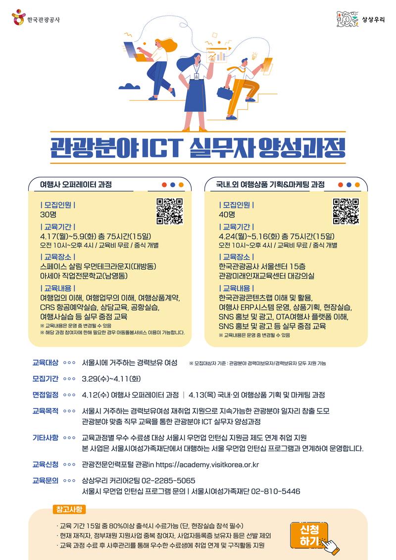 [교육 프로그램 소개] 본 과정은 서울시 경력보유여성의 재취업 지원을 위해 서울시여성가족재단과 한국관광공사가 공동협력사업으로 추진하는 사업입니다. 전문 직무 교육(관광분야 ICT 실무자 양성과정) 수료 후, 우수 수료생 대상 인턴십을 매칭하여 일경험을 제공합니다. 서울시에 거주하는 경력을 보유하고 있는 미취업 여성은 모두 지원할 수 있습니다. [수강혜택] 교육비 전액 무료 우수 수료생 대상 인턴십 제공(3개월) 인턴십 종료 후 정규직 취업 연계 및 채용 정보 제공 [지원대상] 서울시에 거주하는 경력보유여성(미취업자) [모집요강] 지원방법 : 한국관광공사 HP 및 관광전문인력포털 관광in (관광 ICT)여행사 오퍼레이터 과정 https://kto.visitkorea.or.kr/kor/notice/news/noti/board/view.kto?id=447295&isNotice=false&instanceId=124&rnum=5 (관광ICT) 국내·외 여행상품 기획 및 마케팅 과정 https://kto.visitkorea.or.kr/kor/notice/news/noti/board/view.kto?id=447296&isNotice=false&instanceId=124&rnum=4 [모집개요] ○ 모집기간 : 3.29.(수) \~ 4.11.(화) ○ 교육기간 -(여행사 오페러이터 과정) 4.17.(월) \~ 5.9.(화) 총 75시간(15일) -(여행상품 기획&마케팅 과정) 4.24.(월) \~ 5.16.(화) 총 75시간(15일) ○ 선발절차 : 지원서 접수 > 서류 적격 > 면접 심사 > 선발 ○ 교육장소 -(여행사 오퍼레이터) 스페이스 살림 우먼테크라운지(서울 동작구 대방동) 외 -(여행상품 기획&마케팅) 한국관광공사 서울센터 15층(서울 중구) 외
