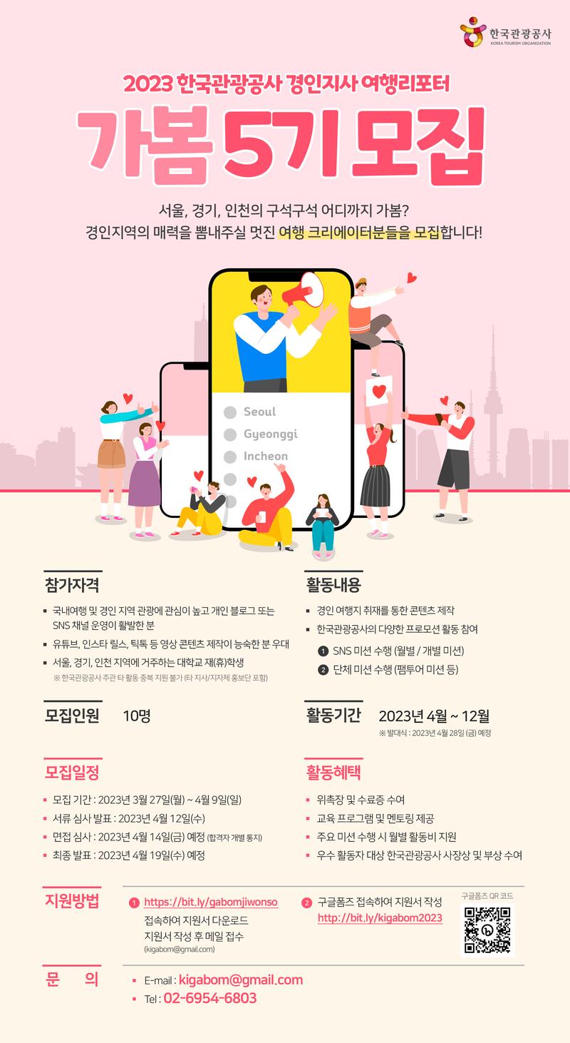 ○ 참가 자격 ☞ 서울, 경기, 인천 지역에 거주하는 대학교 재(휴)학생 및 일반인 ☞ 국내여행 및 경인 관광 활성화에 관심 많고 개인 블로그 또는 SNS채널 운영이 활발한 분 ☞ 유튜브, 인스타그램 릴스, 틱톡 등 영상 콘텐츠 제작이 능숙한 분 우대 ※ 한국관광공사 주관 타 활동(타 지사/지자체 홍보단 포함) 중복지원 불가 ○ 모집인원 ☞ 10명 ○ 모집일정 ☞ 모집 기간 : 2023년 3월 27일 (월) \~ 4월 9일 (일) ☞ 서류 심사 발표 : 2023년 4월 12일 (수) ☞ 대면 면접 : 2023년 4월 14일 (금) 예정 (합격자 개별 통지) ☞ 최종 발표 : 2023년 4월 19일 (수) 예정 ○ 활동내용 ☞ 경인 여행지 취재를 통한 콘텐츠 제작 ☞ 한국관광공사의 다양한 프로모션 활동 참여 ① SNS미션 수행 (월별 / 개별 미션) ② 단체 미션 수행 (팸투어 참여 등) ○ 활동 기간 ☞ 2023년 4월 \~ 12월 ※ 발대식 : 2023년 4월 28일 (금) 예정 ○ 혜택내역 ☞ 위촉장 및 수료증 수여 ☞ 교육 프로그램 및 멘토링 제공 ☞ 주요 미션 수행 시 월별 활동비 지원 ☞ 우수 활동자 대상 한국관광공사 사장상 및 부상 수여 ○ 지원 방법 구글폼즈 접속하여 지원서 작성http://bit.ly/kigabom2023 문의 - E : kigabom@gmail.com - ☏ : 02-6954-6803