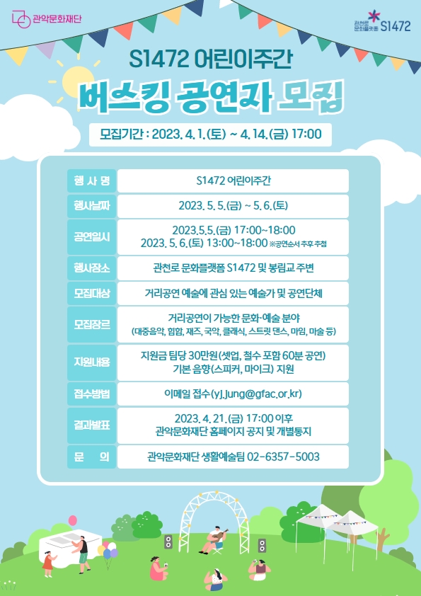 ※ 자세한 내용은 관악문화재단 홈페이지(www.gfac.or.kr)를 참고해주세요. ※ 지원신청서 양식을 다운 받아 작성 후, 이메일로 접수해주세요.(yj.jung@gfac.or.kr)