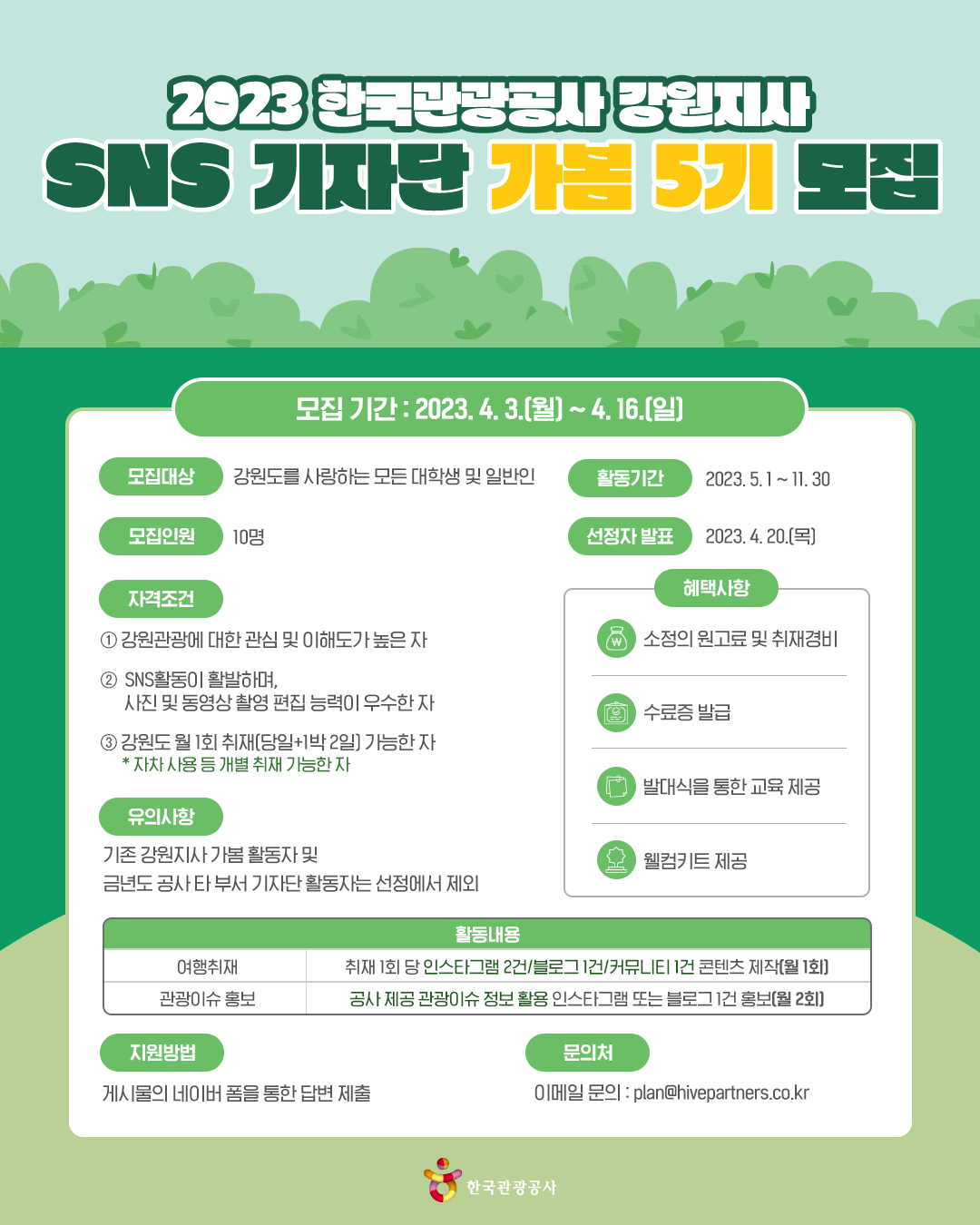 ○ 모집개요 - 2023 한국관광공사 강원지사 SNS 기자단 가봄 5기 모집을 시작합니다! 강원도를 사랑하는 사람이라면 누!구!나! 지원 가능 아름다운 자연을 품은 강원을 널리 알릴 수 있는 기회! 여러분의 많은 관심과 지원 기대할게요!