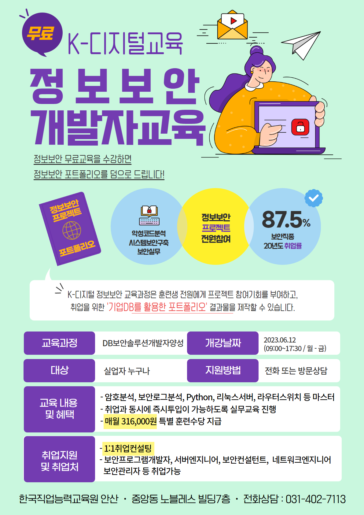 📍 (정보보안) DB보안솔루션(JAVA,C++) 개발자양성 과정은? 한직교 안산과 IT 보안솔루션 개발업체 및 협회와 협약하여, 비전공자도 실무교육을 배워서 소프트웨어개발자, 네트워크 엔지니어로 취업할 수 있도록 도움을 주는 과정입니다.
