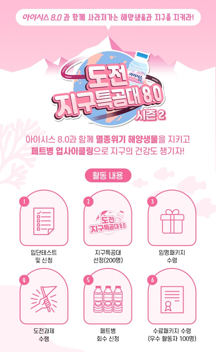 ● 모집 개요 아이시스 8.0과 함께 멸종위기 해양생물을 지키고 페트병 업사이클링으로 지구의 건강도 챙기자! 아이시스 8.0은 리멤버미 캠페인을 통해 판매수익금 일부를 기부하여, 멸종위기종 보호를 위한 거문도 해양생물다양성 프로젝트를 진행합니다