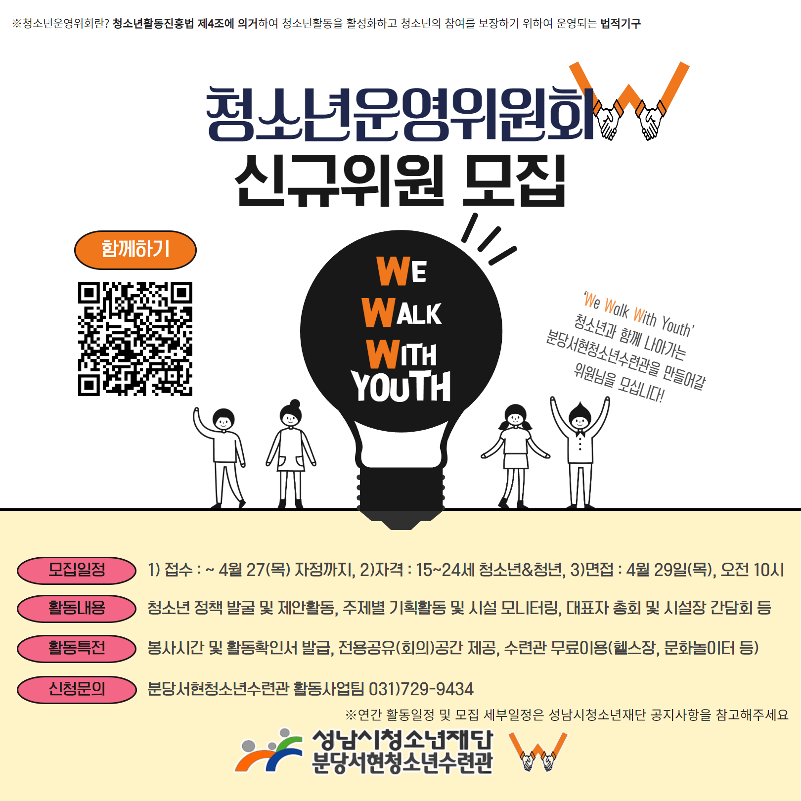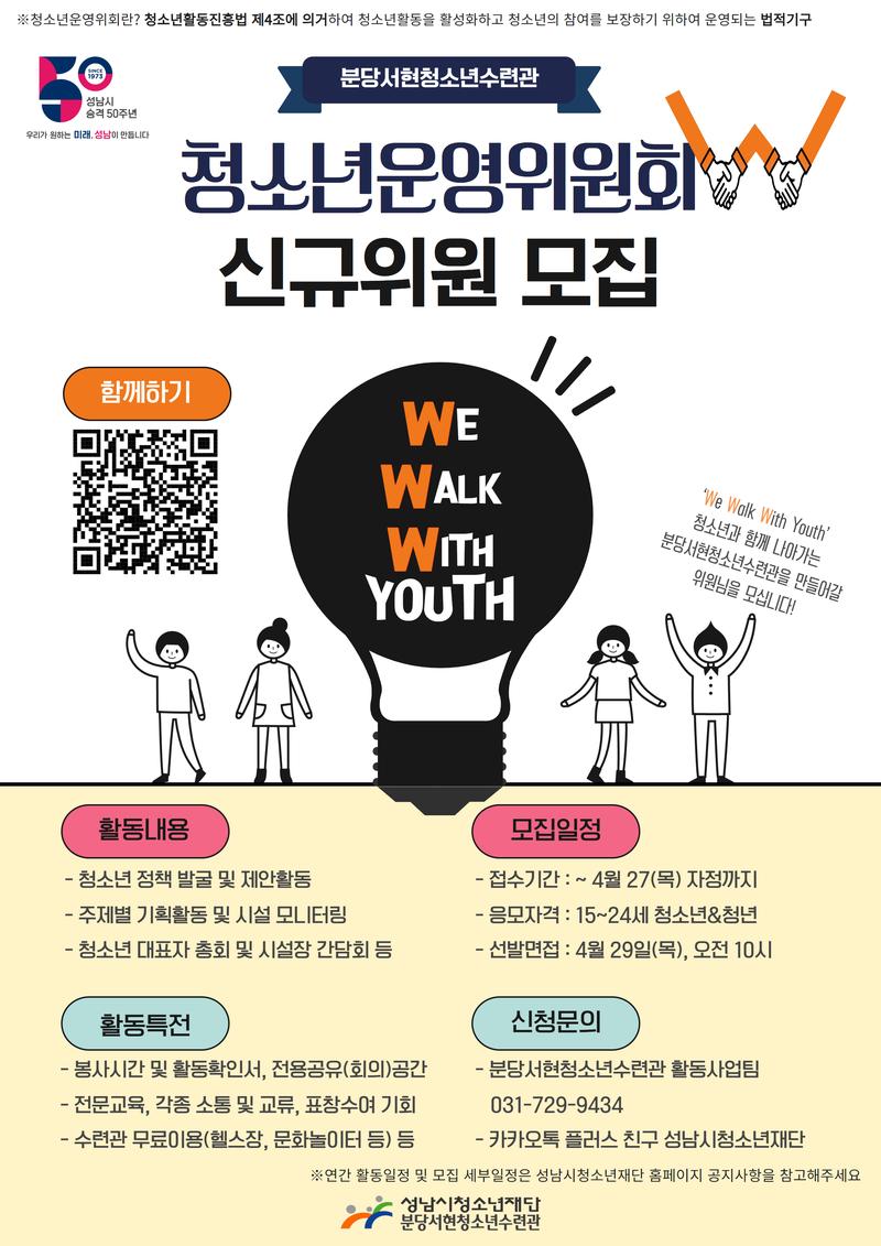청소년운영위원회W 신규위원 모집 *청소년운영위원회란? 청소년활동진흥법 제4조에 의거하여 청소년활동을 활성화하고 청소년의 참여를 보장하기 위하여 운영되는 법적기구 ‘We Walk With Youth’ 청소년과 함께 나아가는 분당서현청소년수련관을 만들어나갈 청소년운영위원회W에서는 청소년수련관 운영 및 각종 프로그램 등의 자문평가에 직접 참여하고, 각종 기횔활동 추진을 통해 청소년수련시설로서 원활한 역할 수행과 청소년 참여의식 확대를 도모합니다. ❍ 지원자격 - 성남시 거주, 재학, 활동 등 15 \~ 24세 청소년(대학생, 청년) ❍ 지원기간 - 4월 27일(목) 자정까지 ❍ 신청방법 - 온라인 접수(https://forms.gle/npNsb9vAJTgPS4V88) ❍ 선발면접 - 4월 29일(토)\, 오전 10시\, 분당서현청소년수련관 2층 청소년운영위원회실(참여터) ❍ 합격자발표 - 5월 2일(화)\, 개별연락 ❍ 활동내용 - 청소년 정책 발굴 및 제안활동, 주제별 기획활동 및 시설 모니터링, 청소년대표자 총회 및 시설장 간담회 등 ❍ 활동일정 - 신청링크를 통해 확인가능 ❍ 활동혜택 - 봉사시간 및 활동확인서 발급, 전용공유(회의)공간 제공, 전문교육, 각종 소통 및 교류, 표창수여 기회 제공, 수련관 무료이용(헬스장, 문화놀이터 등) ❍ 문의 - 031)729-9434