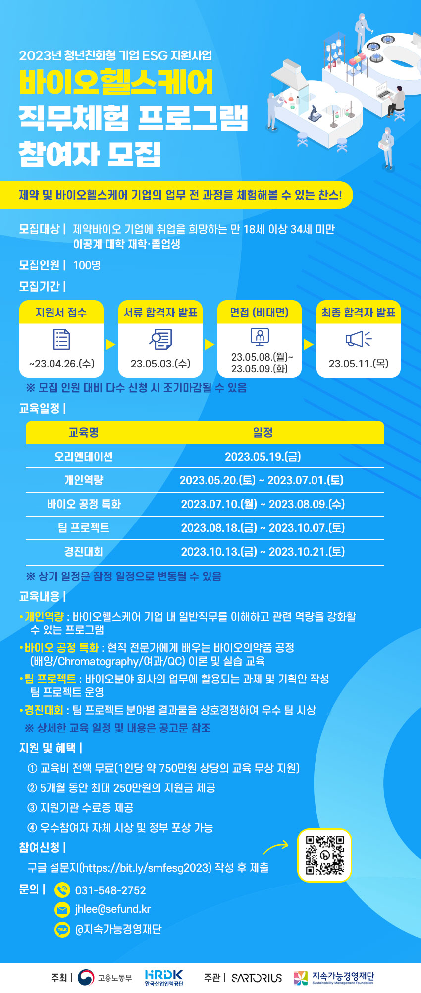 ○ 모집개요 - 고용노동부와 한국산업인력공단이 주최하는 「2023년 청년친화형 기업 ESG 지원사업」에 선정된 싸토리우스코리아바이오텍과 지속가능경영재단이 '바이오헬스케어 직무체험 프로그램'의 참여자를 모집합니다. 관심 있는 분들의 많은 참여를 부탁드립니다.