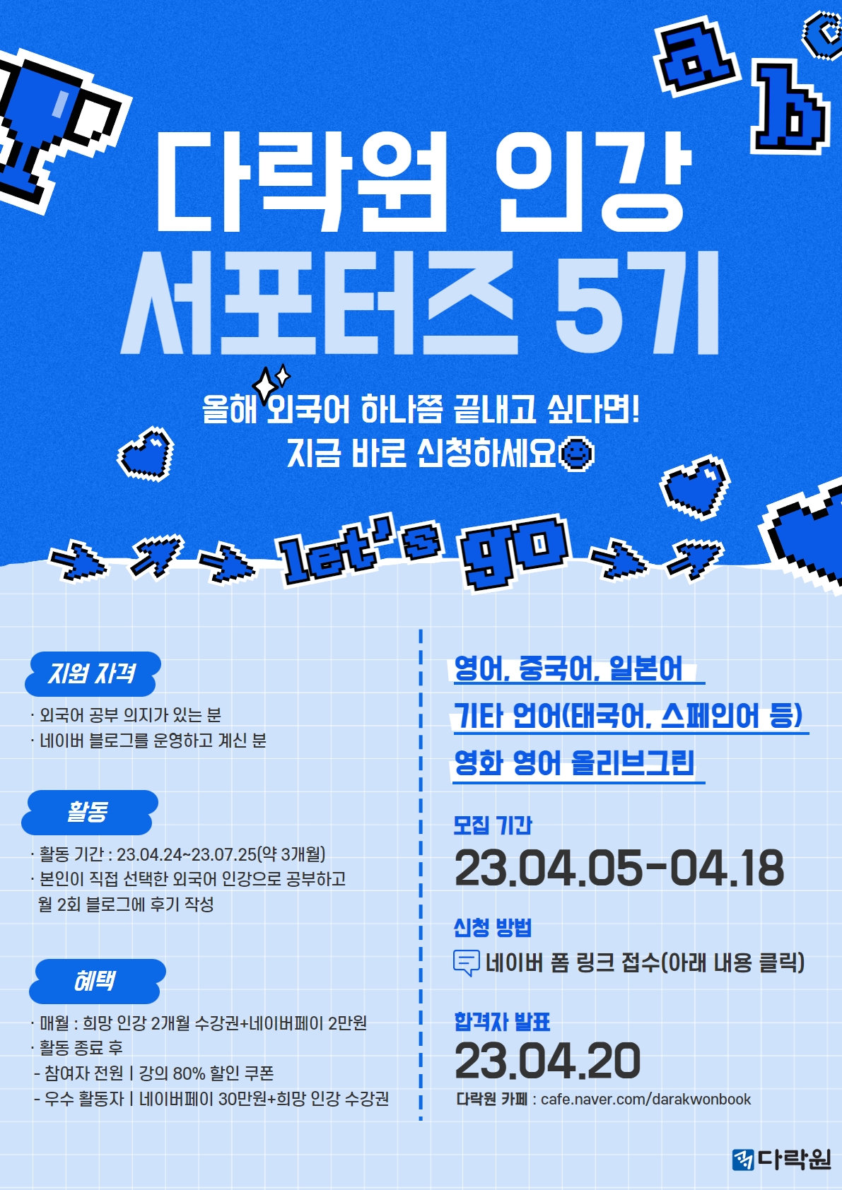 ■ 모집 기간 - 모집 기간 : \~23년 4월 18일 - 발표 : 23년 4월 20일, 다락원 카페 - 활동 기간 : 23년 4월 24일\~23년 7월 25일(약 3개월)