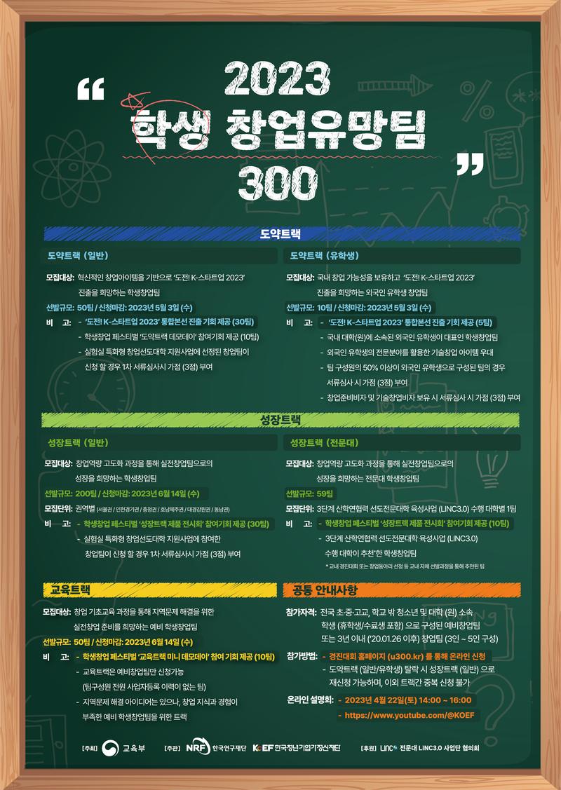 기업가정신을 갖춘 준비된 창업가형 인재발굴 및 육성을 위하여 대한민국 모든 학생(외국인 유학생 등)을 대상으로 성장 단계별 창업교육 중심의 "창업유망팀 300"에 참여할 학생창업팀을 선발하오니 많은 관심과 참여를 바랍니다. ■ 대회개요 ○ (목적) 혁신적 아이디어와 기술을 가진 전국 학생들의 창업 도전 의식을 고취하고 범국민적 창업문화 확산 ○ (내용) 유망한 학생창업팀 발굴 및 성장 단계별 창업교육과 멘토링 등 지원을 통해 사업화 성공모델 창출 및 확산 ■ 모집개요(도약트랙(유학생)) ○ (대상) 국내 창업 가능성을 보유하고 부처통합 경진대회 진출을 희망하는 외국인 유학생 창업팀 ○ (선발규모) 10팀 ○ (신청기간) \~ 2023년 5월 3일(수) ○ (비고) - 국내 대학(원)의 소속 된 외국인 유학생이 대표인 학생창업팀 - 외국인 유학생의 전문분야를 활용한 기술창업 창업 아이템 우대 - 창업준비비자 및 기술창업비자 보유 시 서류심사 시 가점(3점) 부여 - 팀구성원 50% 이상이 외국인 유학생으로 구성된 팀의 경우 가점(3점) 부여 ■ 지원 방법 ○ (신청방법)창업유망팀 300 누리집(http://u300.kr/)을 통해 온라인 신청 ※ 기타 자세한 내용은 붙임으로 첨부되어있는 공고문을 참고해주시기 바랍니다. ■ 활동 내용 ○ 통합본선 진출을 위한 IR 역량강화 교육 실시 : 집체교육 및 1:1 피칭클래스(멘토링) 실시 ○ 창업유망팀 300 네트워킹 - 모의 투자 결과 인기 1팀을 선발하여 상금 수여 - 온라인 모의투자대회 및 오프라인 공식행사에 참여한 최종선발팀에 한해 '교육부 장관 인증서' 수여 ○ 통합본선 진출팀 선발 ○ 후속지원 : 시드 투자유치 후속 엑셀러레이팅 및 타 지원사업 연계 제공 등 ■ 활동 혜택 ○ (상금) 모의투자대회 인기상 트랙별 상금(50만원) ○ (집중육성) 1:1 피칭클래스 멘토링 제공 ○ (인증서) 창업유망팀 인증서(교육부 장관) 발급 ○ (통합본선) 통합본선 진출 기회 제공(유학생 5팀) ○ (기타) 주관기관 창업관련 지원 프로그램 선발시 가산점 부여 및 우대, 민간 타부처 지원사업(KDB 스타트업 프로그램, IP 디딤돌 등) 연계기회 제공 ■ 기타안내 ※ 기타 자세한 내용은“2023 학생 창업유망팀 300 공고문”을 참고해주시기 바랍니다. ■ 문의 사항 ○ 창업유망팀 300 카카오채널(pf.kakao.com/_xiAyNd)
