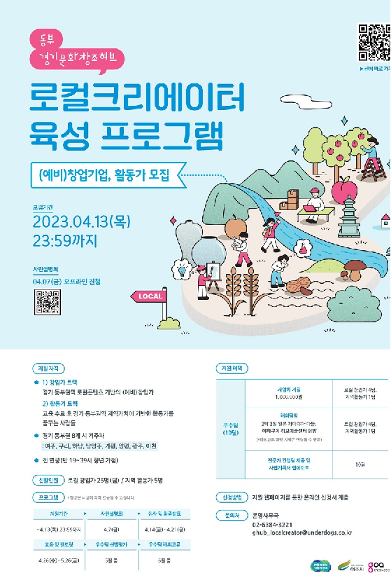 ◈신청방법 지원 웹페이지를 통한 온라인 신청서 제출 ◈문의처 운영사무국 - 02-6384-3221 - ghub_localcreator@underdogs.co.kr