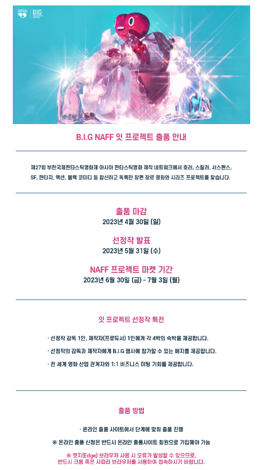 문의 부천국제판타스틱영화제 산업프로그램팀 Tel) 032-327-6313 (내선 144) naff.itproject@bifan.kr