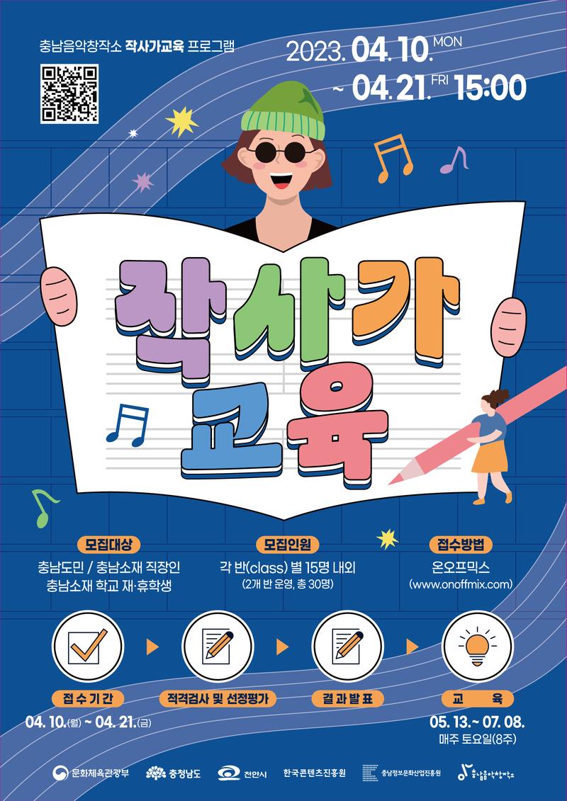 ✏ 접수기간 : 2023. 04. 10.(월)\~2023.04.21.(금) 15:00까지 ✏ 모집인원 : 각 클래스별 15명 내외(A반, B반) ✏ 모집대상 : 충남도민 또는 충남소재 직장/학교 재직/재학 중인 자 ✏ 접수방법 : 온오프믹스로 접수(https://www.onoffmix.com/) 💡 자세한 정보는 충남음악창작소 홈페이지 또는 QR코드를 확인하세요!