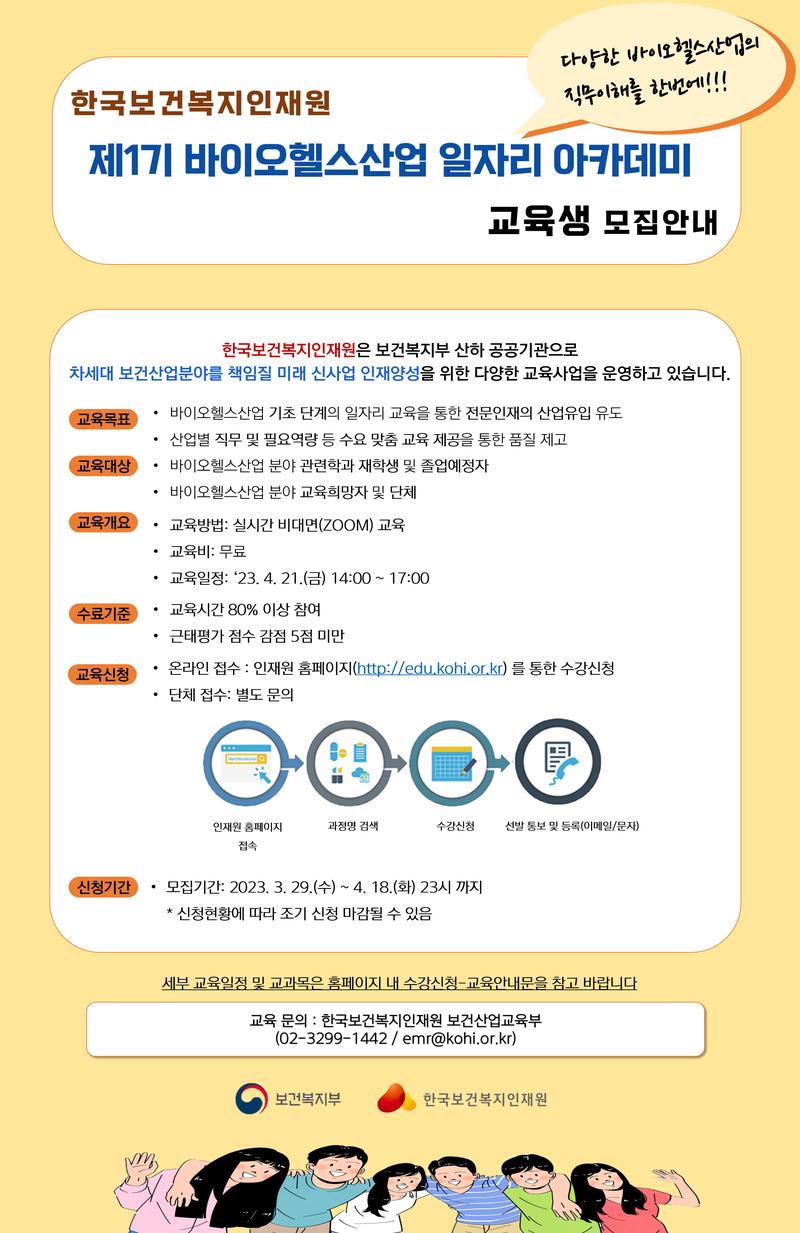 1. 교육과정: `23년 제1기 바이오헬스산업 일자리 아카데미 (제약바이오산업의 이해) 2. 교육일정: `23. 4. 21.(금) 14:00\~17:00 3. 교육방법: 실시간 비대면(ZOOM) 교육 4. 교육비: 무료 5. 교육신청 방법: 보건복지배움인 접속 후\, '일자리' 또는 '아카데미' 검색 후 수강신청 6. 교육문의: 한국보건복지인재원 보건산업교육부 (emr@kohi.or.kr / 02-3299-1442)