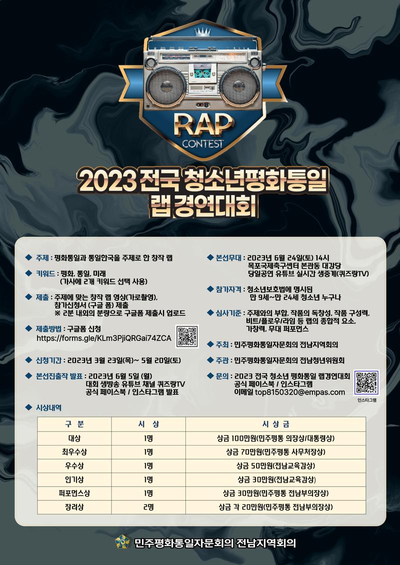 안녕하세요 우승자에게 대통령상과 100만원의 시상금이 수여되는 [2023 전국 청소년 평화통일 랩경연대회] 운영진 입니다