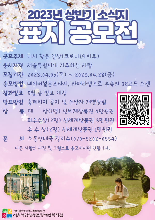 코로나19 팬데믹이 지나고, 드디어 마스크를 벗고 살아가는 때가 왔습니다:) 여러분은 어떻게 살아가고 있나요? 서울시립영등포장애인복지관에서 "다시 찾은 일상"을 주제로 소식지 표지 작품 공모전을 진행합니다.