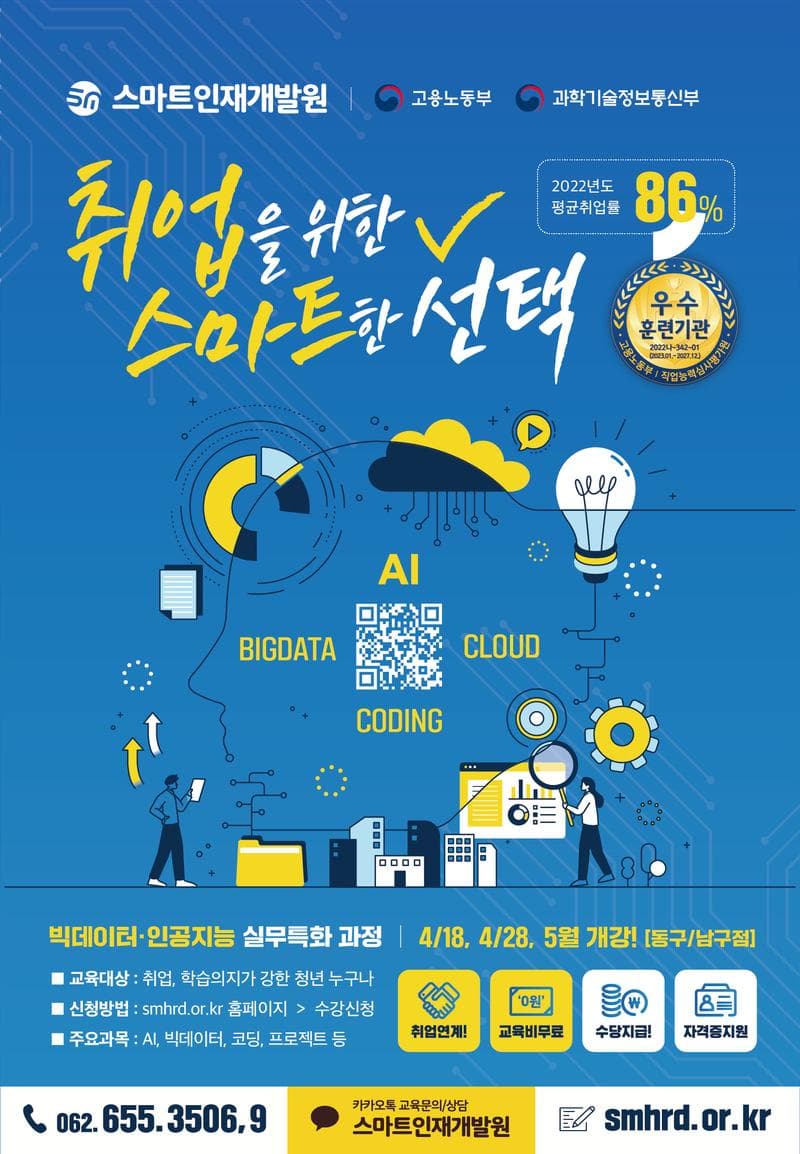 취업을 위한 스마트한 선택! 빅데이터·인공지능 실무특화 과정이 궁금하다면?! 스마트인재개발원의 4월 OPEN 과정을 지금 바로 신청하세요! 2022년도 취업률 86% 달성!! 고용노동부 & 직업능력심사평가원이 선정한 우수훈련기관 스마트인재개발원이 당신의 취업을 함께 합니다!