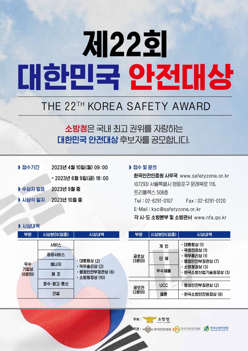 제22회 대한민국안전대상 안전문화 콘텐츠 공모전(UCC, 웹툰) ○ 기간 및 일정 - 접수기간 : 2023년 4월 10일(월) \~ 6월 9일(금) 18:00까지 - 시상식 : 10월 중 ○ 공모주제 - 화재 예방 아이디어 및 소방 정책 이야기 ○ 지원자격 - 누구나 (단, 팀으로 응모 시 3인 이내) ○ 신청서류 신청서 1부 서약서 1부 출품작품 1부 ○ UCC 출품규격 디지털카메라, 휴대폰 등 영상기구로 촬영한 영상 - 3분 이내 1GB 미만의 MP4, AVI 또는 WMV 등(1920*1080 Pixel 해상도) - 동영상을 업로드한 개인 영상 사이트 주소(유튜브)를 신청서에 기재 ○ 웹툰 출품규격 JPEG 또는 PNG 형식 가로 700픽셀, 세로 제한없음 4\~8컷 단편 완결 만화(해상도 300dpi 이상) ○ 시상내역 - 행정안전부장관상 100만원 - 한국소방안전원장상 50만원 ○ 문의 및 접수 [한국안전인증원 사무국 02-6291-0101] - 이메일 : ksc@safetyzone.or.kr - 우 편 : 서울 영등포구 문래북로 116, 508호