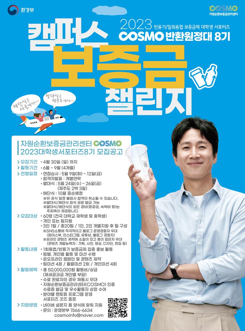자원순환보증금관리센터(COSMO)에서 ‘반환원정대’ 대학생 서포터즈 8기를 모집합니다. ⬥모집대상 : 전국 대학생 재학생 및 휴학생 - sns(페이스북, 인스타, 유튜브, 블로그)소통에 적극적이고 블로그 운영 경험자 우대 - 온라인 콘텐츠 제작에 소질이 있고 흥이 많은자 우대 (콘텐츠 개발능력자 : 기획, 사진, 영상, 디자인, 편집 등) ⬥모집인원 : 총 60명 - 개인 또는 팀 지원 - 3인 1팀 / 총 20팀 / 1인, 2인 [개별지원 후 팀 구성] ⬥모집기간 : 4월 30일 (일)까지 ⬥활동기간 : 6월 \~ 9월 (4개월) ⬥전형일정 - 면접심사 : 5월 9일(화) \~ 12일(금) - 합격자 발표 : 개별연락 - 발대식 : 5월 24일(수) \~5월 26일(금) [제주도 2박 3일] - 해단식 : 10월 중순예정 ※ 위 공식 일정 불참 시 합격이 취소될 수 있습니다. ※ 발대식/해단식 참석 공문 발급 가능 ※ 발대식/해단식의 모든 경비(항공권, 숙박비 등)는 주최측에서 제공합니다. ⬥지원 방법 : - (필수) 네이버 설문지 폼 양식에 맞춰 지원 (URL : https://naver.me/FbiL6PcY ) - (선택) 포트폴리오 및 소개영상 (이메일 제출 : cosmoinfo@naver.com ) ⬥활동내용 - 1회용컵/빈용기 보증금제 집중 홍보 활동 - 팀별, 개인별 활동 및 미션 수행 - 온오프라인 캠페인 및 콘텐츠 제작 - 팀미션 4회 / 돌발미션 2회 / 개인미션 4회 ⬥활동혜택 - 총 50,000,000원 활동비 / 상금 (제세공과금 개인별 부담) - 수료 완료자의 경우 채용시 우대 - 자원순환보증금관리센터(COSMO)인증 수료증 발급 및 우수활동자 상장 수여 - 분야별 멘토링 프로그램 운영 - 서포터즈 굿즈 증정 발대식은 제주도에서\~ 해단식은 서울에서\~ 대학생들이 만들어가는 자원순환 탐험 반환원정대 이야기!! ⬥문의 운영본부 : 1566-6634 이메일 : cosmoinfo@naver.com COSMO 홈페이지 - https://www.cosmo.or.kr/home/main.do COSMO 인스타그램 - https://www.instagram.com/cosmo_sns/ COSMO 페이스북 - https://www.facebook.com/cosmosns0610 COSMO 블로그 - https://blog.naver.com/cosmo_sns COSMO 반원원정대 홈페이지 - http://rebottle.kr/