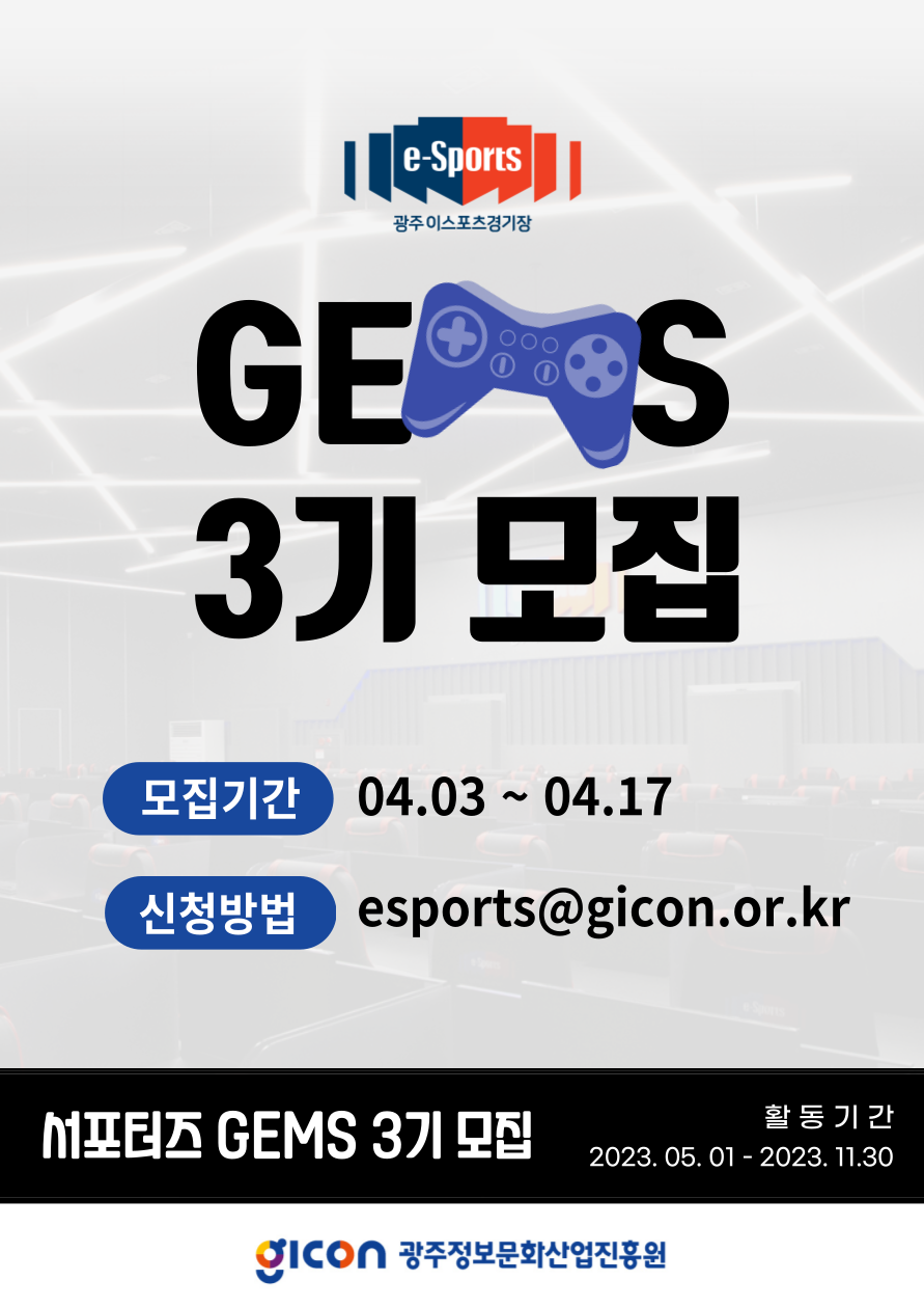 모두가 즐기는 e-sports 세계로!! esports를 즐기고, 관심있는 누구나 ! 단순 취미뿐 아니라 이스포츠 방송제작 등 직접 참여할 수 있는 '광주이스포츠경기장 서포터즈 GEMS'를 모집합니다!