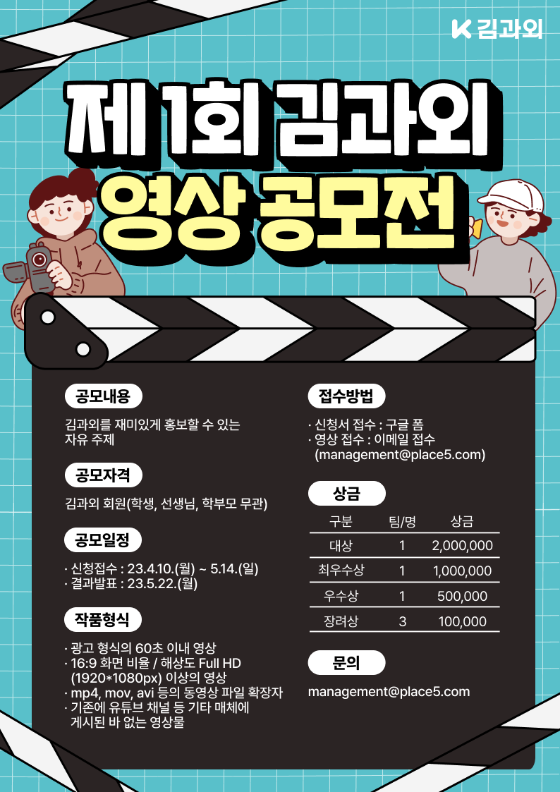 ● 공모안내 응모 기간 : 2023.04.10.(월)\~05.14.(일) 최종 선정작 발표 : 05.22.(월) (내부 사정으로 변동될 수 있음) 응모 구분 : 개인 또는 팀 응모 자격 : 김과외에 회원가입이 되어 있는 자 (학생, 학부모, 선생님 계정 무관) 접수 방법 (두 가지 모두 제출해야 참가 인정) 1) 참가 신청서 : 구글폼 제출 (https://forms.gle/Sxzd5aeHx7g4wX849)) 2) 영상 제출 : 이메일 지원 (management@place5.com) 자세한 내용은 공모전 사이트를 참고해 주시길 바랍니다. (https://bit.ly/KimStudy_Festival)