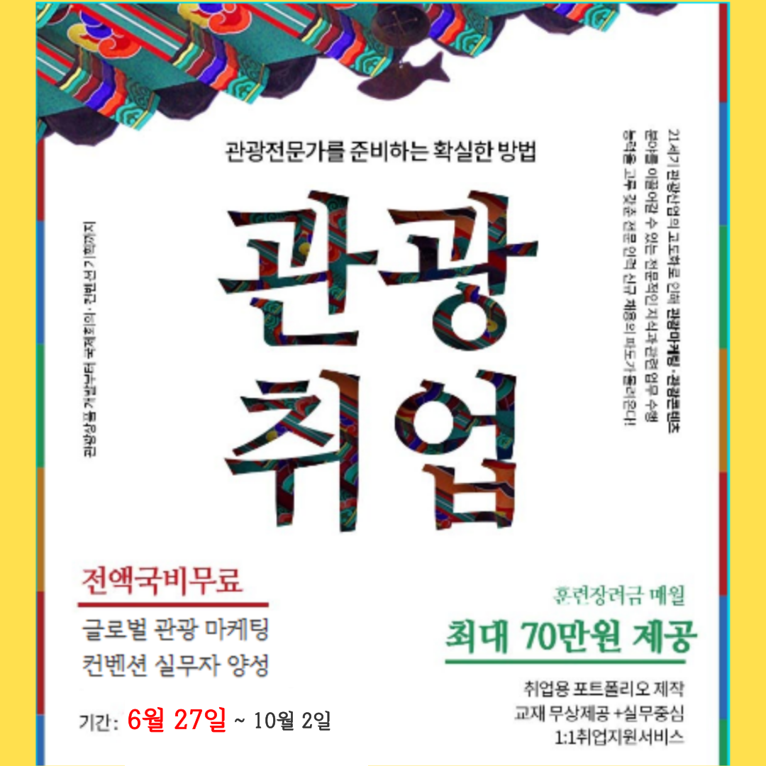 😄다양한 혜택과 관광/MICE컨벤션분야 취업핵심인 포트폴리오까지 준비할 수 있는 과정인 만큼 해당 과정은 인기가 많아 조기에 모집이 마감될 수 있는 점 참고해주세요. 👉 빠른 수강신청 : 홈페이지(www.취업교육.com)