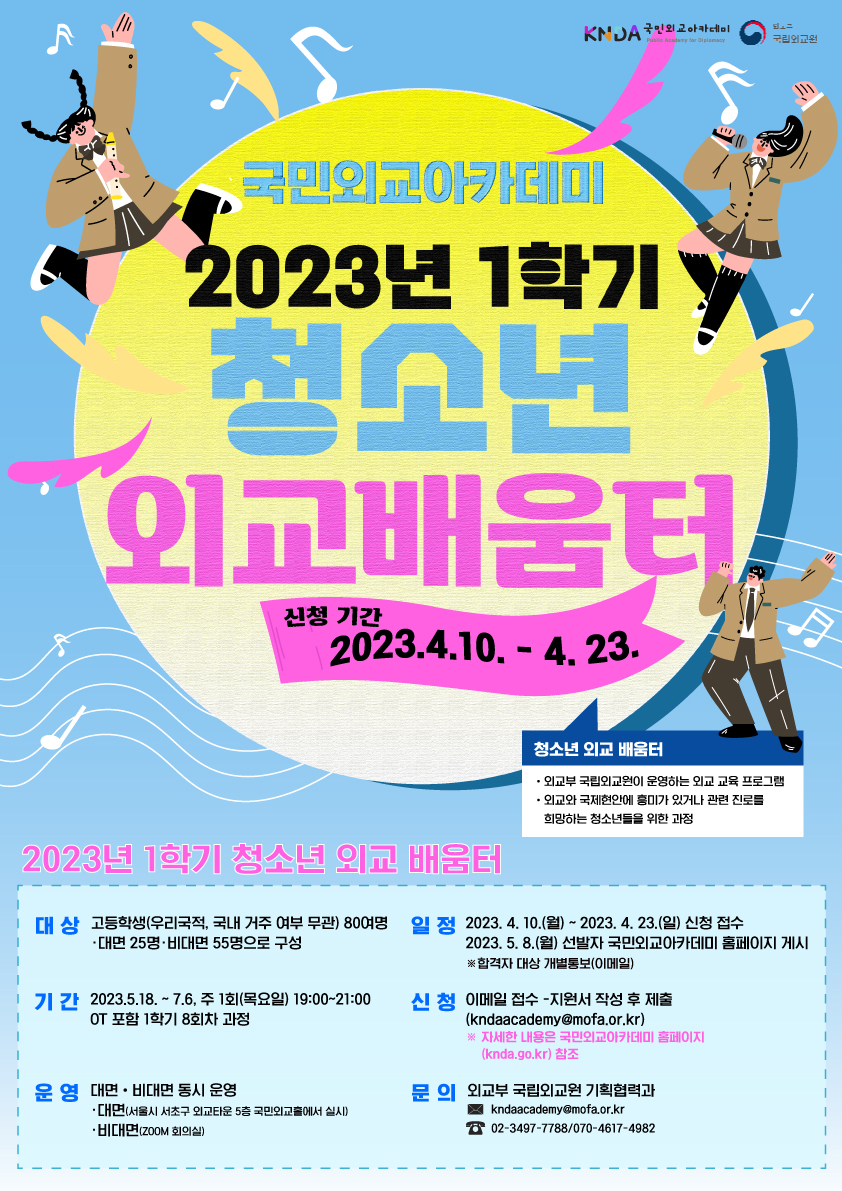 외교부 국립외교원이 운영하는 외교 교육 프로그램, 국민외교아카데미 청소년 외교 배움터에서 외교와 국제현안에 흥미가 있거나 관련 진로를 희망하는 청소년들을 모집합니다. ▶대상 -고등학생(우리국적, 국내 거주 여부 무관) 80여명 -대면 25명/비대면 55명으로 구성 ▶기간 -2023. 5. 18. \~ 7. 6. 주 1회(목요일) 19:00 \~ 21:00 -OT 포함 1학기 8회차 과정 ▶일정 -신청 접수 : 2023. 4. 10.(월) \~ 4. 23.(일) -합격 발표 : 2023. 5. 8.(월) 선발자 국민외교아카데미 홈페이지 게시 ※ 합격자 대상 개별통보(이메일) ▶신청 -지원서 작성 후 (kndaacademy@mofa.go.kr.) 이메일 제출 자세한 내용은 국민외교아카데미 홈페이지(knda@go.kr)를 참고해주세요.