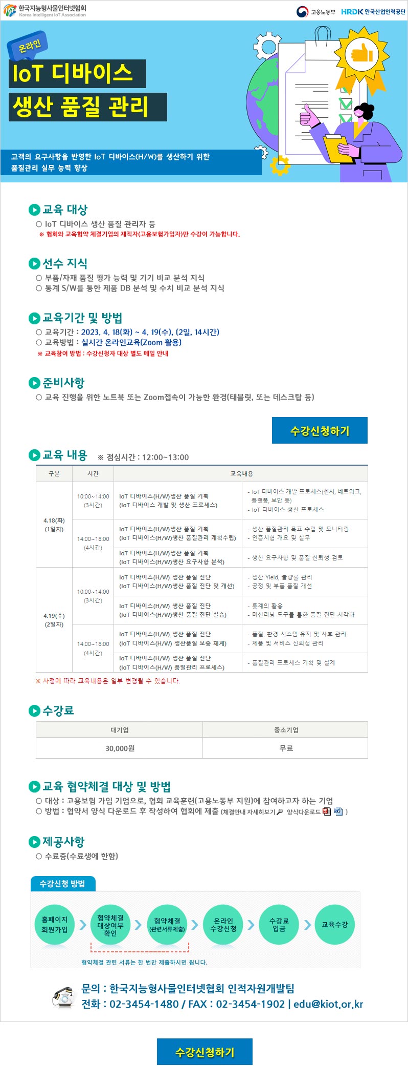 ■ 교육 목표 : 고객의 요구사항을 반영항 IoT디바이스(H/W)를 생산하기 위한 품질관리 실무 능력 향상 ■ 교육 대상 : IoT 디바이스 생산 품질 관리자 등 ■ 교육 기간 : 2023. 4. 18(화) \~ 4. 19(수) ■ 교육 장소 : ZOOM ■ 준비사항 : 실습교육을 위한 노트북 지참 ■ 수강료 : (중소기업 재직자) 무료 / (대기업 재직자) 30,000원