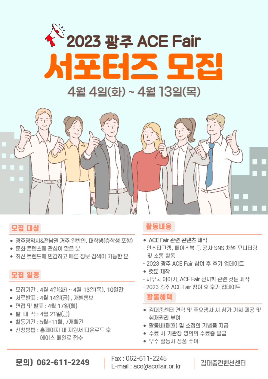 ◇ 문의처 - ACE Fair 사무국 정은주 PM (062-611-2249\, ace@acefair.or.kr) ※ 기재내용이 허위로 밝혀질 경우 모든 책임은 지원자에게 있으며, 선발이 취소될 수 있습니다. ※ 기타 자세한 사항은 홈페이지 모집 공고를 참고하시기 바랍니다.
