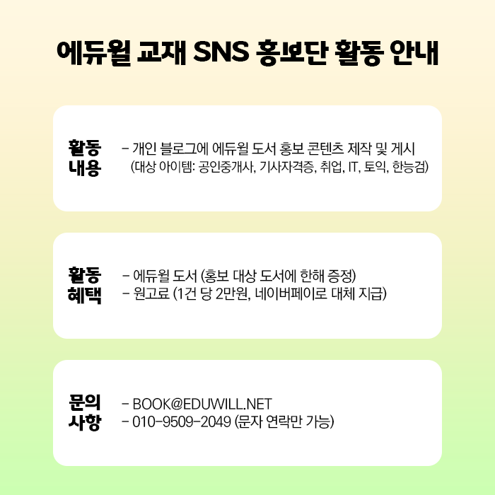 이번에 처음으로 모집하게 된 에듀윌 교재 SNS 홍보단은 앞서 말씀드린대로 에듀윌의 다양한 자격/수험서를 직접 학습해 보고, 본인의 블로그에 홍보 콘텐츠를 제작 및 게시해 주시는 활동을 진행하시게 될텐데요! 참여해 주신 분들께는 에듀윌의 다양한 교재를 직접 학습해 보실 수 있는 기회와 소정의 원고료도 지급해 드릴 예정이랍니다. ☝ 활성화 된 네이버 블로그를 소유하고 있고, ✌ 에듀윌 교재로 공부하고 자격증&취업 등 합격하고 싶다면? 참여하지 않을 이유가 없는 <에듀윌 교재 SNS 홍보단>! 모집과 활동 관련한 내용과 에듀윌 교재 SNS 홍보단 신청 방법까지, 아래에서 조금 더 자세히 알려드릴게요!