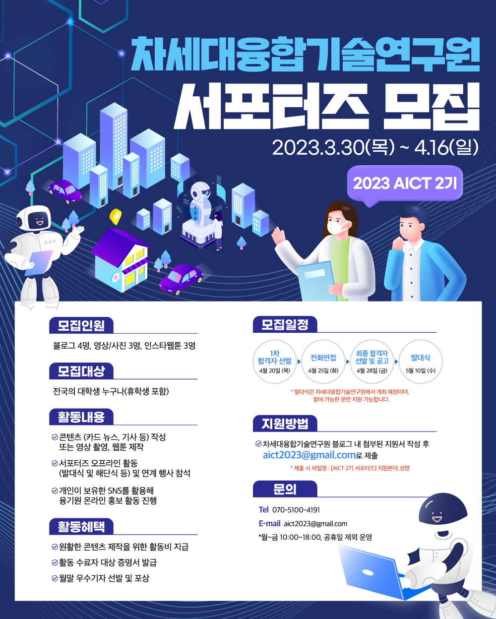 차세대융합기술연구원에서 2023 AICT 서포터즈 2기를 모집하고 있으니 관심있는 대학생(휴학생) 여러분들의 많은 지원 바랍니다 [차세대융합기술연구원 2023 AICT 2기 서포터즈 모집] ■ 모집대상 : 대학생 누구나(휴학생 포함)