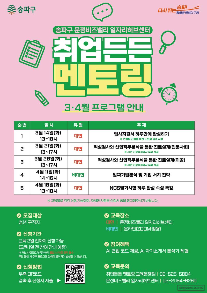 ■ 문의처 - 취업 든든 멘토링 교육운영팀 : 02-525-5884 - 문정비즈밸리 일자리허브센터 : 02-2054-8260