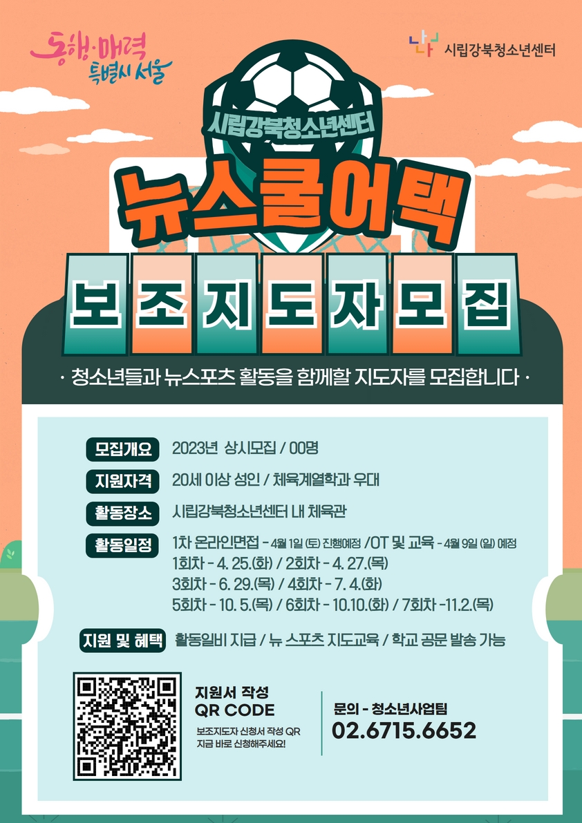 안녕하세요 시립강북청소년센터입니다. 청소년 친구들과 함께 뉴스포츠 활동을 진행할 보조지도자를 모집합니다! 뉴 스포츠에 대한 경험이 없더라도 프로그램 실시 전 교육 후 진행되기 때문에 청소년과 뉴스포츠에 관심이 있는 분들이라면 누구든지 신청해주세요:)