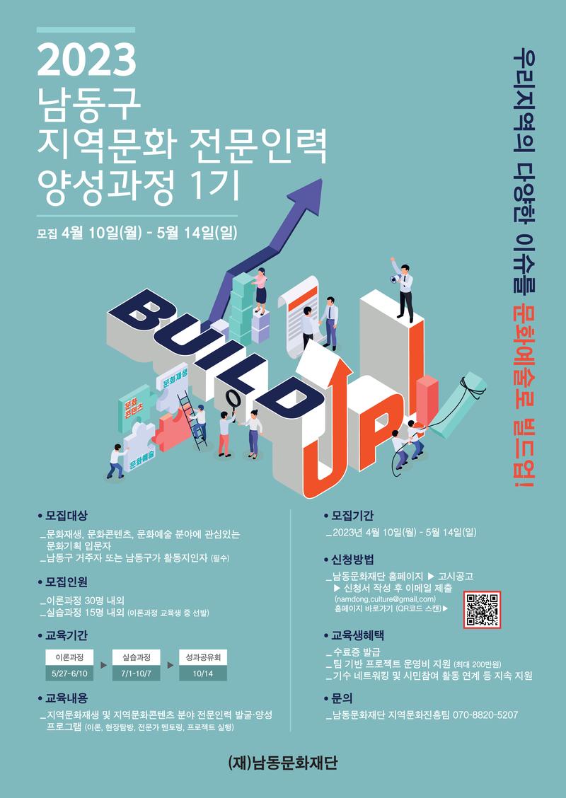 2023 남동구 지역문화 전문인력 양성과정 1기 「빌드업!」 교육생 모집** ○ 모집 기간 및 일정 - 2023년 4월 10일(월) \~ 5월 14일(일)까지 ○ 지원자격 - (필수) 남동구 거주자 또는 남동구가 활동지인 자 - 문화재생, 문화콘텐츠, 문화예술 분야에 관심 있는 문화기획 입문자 ○ 모집인원 - 이론과정 30명 내외 - 실습과정 15명 내외(이론과정 교육생 내 선발) ○ 활동내용 - 이론과정 : 6회(15시간) - 실습과정 : 5회(15시간) - 현장탐방 - 전문가 멘토링 - 프로젝트 실행 ○ 접수방법 - 재단 홈페이지 ▶ 참여알림 ▶ 고시공고 - 신청서 및 동의서 양식 다운로드 및 작성 후 이메일 제출 - 제출서류 : 신청서 및 개인정보 수집·이용·제공 동의서 1부 - 이메일 주소 : namdong.culture@gmail.com - 홈페이지 바로가기 ▶ http://bit.ly/남동구빌드업 ○ 혜택내역 - 이론과정 : 이수증 발급(6회차 중 5회차(80%) 이상 출석 시) - 실습과정 : 팀 기반 프로젝트 운영비 지원(최대 200만원) - 2023년 소래포구 축제 아트존 부스 참여 기회 제공 - 수료증 발급(이론과정 및 실습과정 중 70% 이상 출석 시) - 추후 기수별 네트워킹 및 시민참여 활동 연계 등 지속 활동 ○ 문의 - 남동문화재단 지역문화진흥팀 ☎ 070-8820-5207