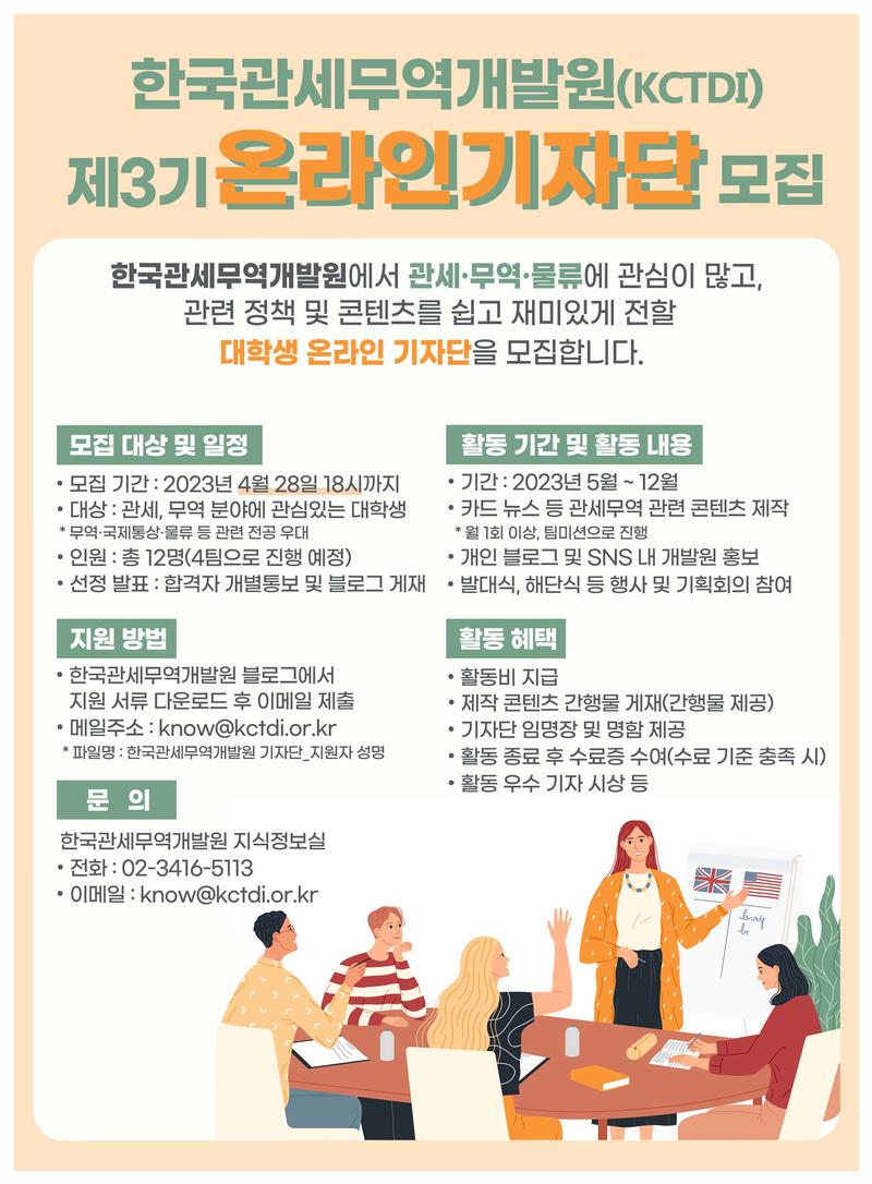 ● 모집 기간 : 2023년 4월 10일(월) \~ 4월 28일(금) 오후 6시까지 ● 모집 인원 : 총 12명 ● 모집 대상 : 관세와 무역에 관심있는 대학생 ● 활동 기간 : 2023년 5월 1일 \~ 12월 31일까지(8개월) ● 활동 내용 : 카드뉴스 등 이미지 콘텐츠 제작, 온라인 홍보 ● 지원 방법 : 필요 서류 작성 후 know@kctdi.or.kr로 이메일 제출 - 필요 서류 : ① 지원서(하단 다운로드)\, ② 과제물(카드뉴스 또는 인포그래픽) ※ 과제물 주제(하단 참조) 중 카드뉴스 또는 인포그래픽 형식 제작(택 1) ※ 카드뉴스 4컷, 인포그래픽 1컷 기준임 ● 우대 사항 : 관세무역 관련 자격증 소지자, 이미지제작 툴 활용 가능자, 관련 활동 유경험자 등 ● 활동 혜택 : ① 활동비 지급(매월), ② 임명장 및 명함 제공, ③ 물류현장 탐방기회 제공, ④ 우수 활동자 포상, ⑤ 간행물·기념품 제공 등 ● 합격자 발표 : 5월 2일(화), 개별 연락 및 블로그 공지