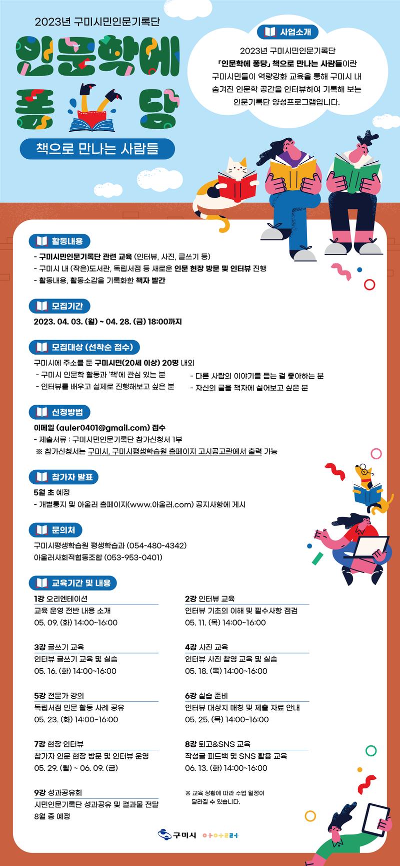 5월부터 6월까지 기본교육&전문가 강의를 통해 구미시 내 (작은)도서관, 독립서점 등 새로운 인문 현장 방문 및 인터뷰를 진행하며 책자를 발간할 예정입니다. 구미시의 인문학 활동을 알릴 새로운 기수의 기록단이 되어주세요 :)
