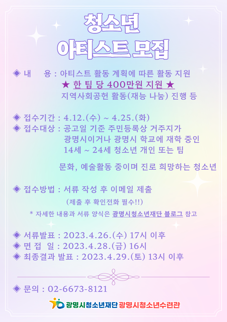 안녕하세요:) 광명시청소년수련관 청소년문화공간 및 여가지원사업 [팡띵 Univ.] 문화. 예술 분야의 청소년 문화 생산자!! \~ 팡띵 청소년 아티스트를 모집합니다 \~ 아티스트들이 직접 주체적으로 활동계획을 수립하고 재능기부 활동도 진행하는 팡팡 튀는 아티스트 세계! 음악, 미술, 문학, 연기, 무용, 사진 등등등등등등등등 아티스트의 활동을 위해 연 400만원을 지원합니다! 문화. 예술 분야의 진로를 희망하고 열심히 활동 중인 다재다능한 청소년 아티스트들의 많은 지원바랍니다:)