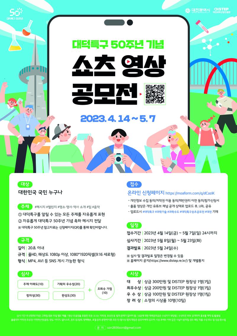 "대덕특구 50주년"을 기념하여 대국민 쇼츠 영상 공모전을 진행합니다. 여러분들의 많은 관심과 참여 부탁드립니다! ■ 공모명 - 대덕특구 50주년 20초 쇼츠 영상 공모전 ■ 공모기간 - 2023.04.14(금) 12시 \~ 05.07(일) 24시 ■ 참가대상 - 대한민국 국민 누구나 ■ 공모주제 (#메시지 #챌린지 #명소・명사・역사 소개 #밈 #음악) - 대덕특구를 알릴 수 있는 모든 주제를 자유롭게 표현 - 자유롭게 대덕특구 50주년 기념 축하 메시지 전달 ■ 영상규격 - 길이 : 20초 이내 - 규격 : 풀HD, 해상도 1080p 이상, 1080*1920픽셀(9:16 세로형) - 형식 : MP4, AVI 등 SNS 게시 가능한 형식 ■ 접수방법 - 온라인 신청페이지 바로가기 : https://moaform.com/q/dCaziK ※ 출품 영상은 개인 유튜브 채널 공개 상태로 업로드 후,URL 공유 ※ 개인정보 수집 동의/저작권 이용 동의/제반권리 이전 동의/참가신청서 ※ 업로드시 #대덕특구 #과학기술 #과학수도 #대덕특구숏츠공모전 #대전 기재 ■ 공모일정 - 심사기간 : 2023.05.08(월)\~05.23(화) - 결과발표 : 2023.05.24(수) ※ 심사 및 결과발표 일정은 변경될 수 있음 ※ 대전과학산업진흥원 홈페이지 공지 및 개별통지 예정 ■ 시상내역 - 대 상 : 상금 300만 원 및 DISTEP 원장상 1명(1팀) - 최우수상 : 상금 200만 원 및 DISTEP 원장상 1명(1팀) - 우 수 상 : 상금 100만 원 및 DISTEP 원장상 1명(1팀) - 장 려 상 : 소정의 시상품 10명(10팀) ■ 심사기준 - 주제 이해도(10)+기획 우수성(20)+창의성(30)+완성도(30)+조회수 가점(10) ■ 문의처 - son2656son@gmail.com