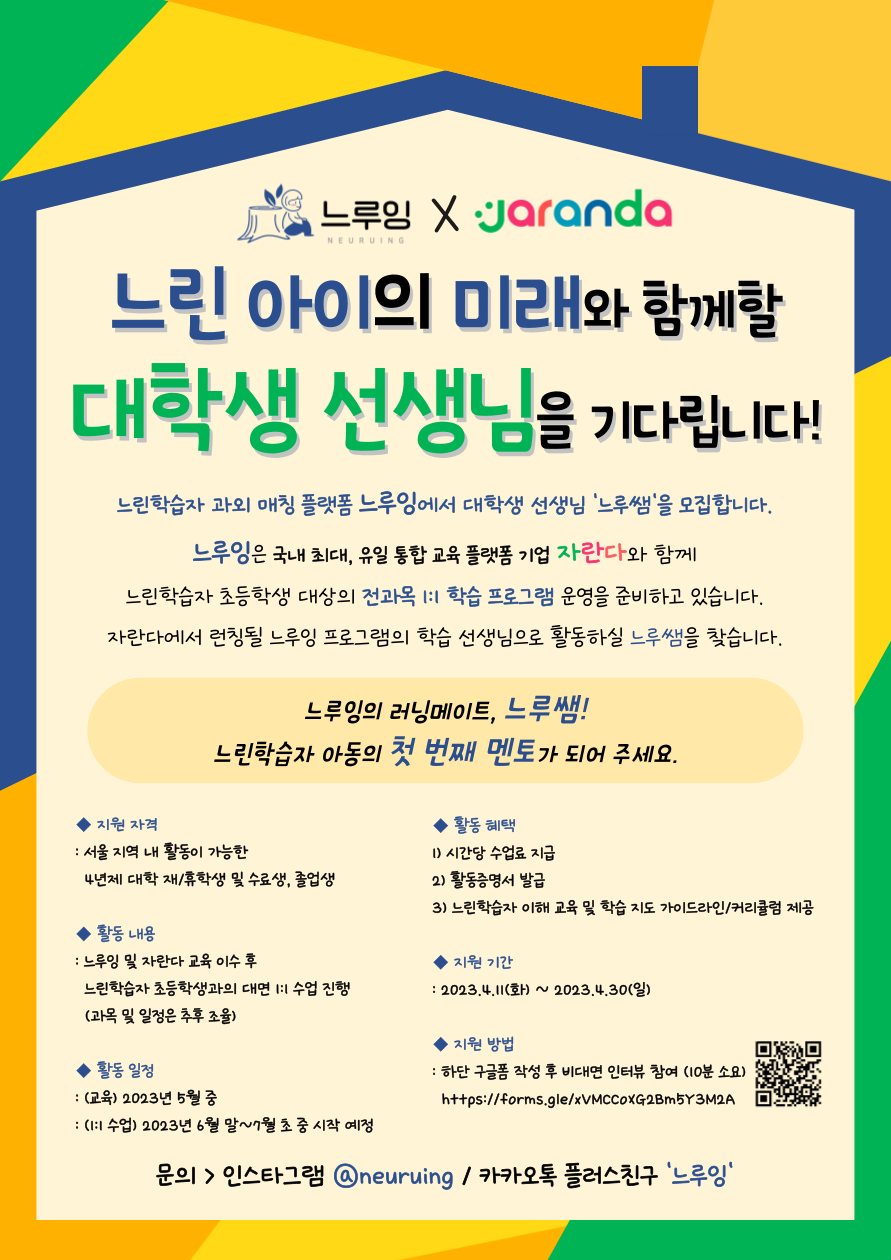 [느루잉 X 자란다] 느린 아이의 미래를 함께 그려 나갈 대학생 선생님을 기다립니다!