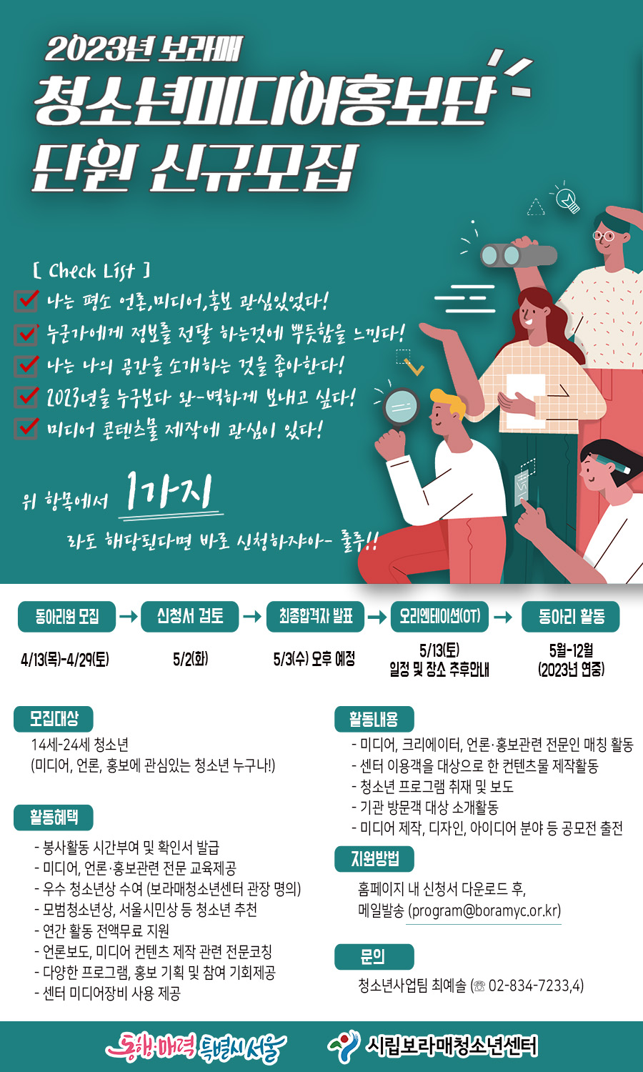 시립보라매청소년센터에서 ‘청소년미디어홍보단’ 활동을 통해 함께 성장 할 동아리원을 모집합니다! * 활동 내용 - 미디어, 크리에이터, 언론, 홍보관련 전문인 연계활동 - 센터 이용객을 대상으로 한 콘텐츠물 제작 - 웹디자인, 인디자인 관련 프로그램 교육 - 청소년 프로그램 취재 및 보도 - 기관 방문객 대상 소개활동 - 미디어제작, 디자인, 아이디어 분야 등 공모전 출전 * 활동 특전 - 봉사활동 시간 부여 및 확인서 발급 - 미디어, 언론, 홍보관련 전문 교육제공 - 우수 활동 청소년 표창장 수여 (모범청소년상, 서울시민상 등) - 연간활동 전액무료 지원 - 언론보도, 미디어 콘텐츠 제작 관련 전문코칭 - 다양한 프로그램, 홍보 기획 기회 제공 - 센터 미디어장비 사용 제공 *활동 기간 2023년 5월\~12월 *모집 기간 \~ 2023년 4월 29일(토) 까지 *모집 대상 - 미디어 홍보활동에 대한 열정이 있는 청소년 14세\~24세 - 열정 넘치고!! 적극적으로 활동할 수 있는 청소년 누구나!! * 신청방법 - 센터 홈페이지 내 [프로그램 안내 전체] 게시글 확인 후, 신청서 다운로드 및 작성 후 메일접수 (program@boramyc.or.kr)