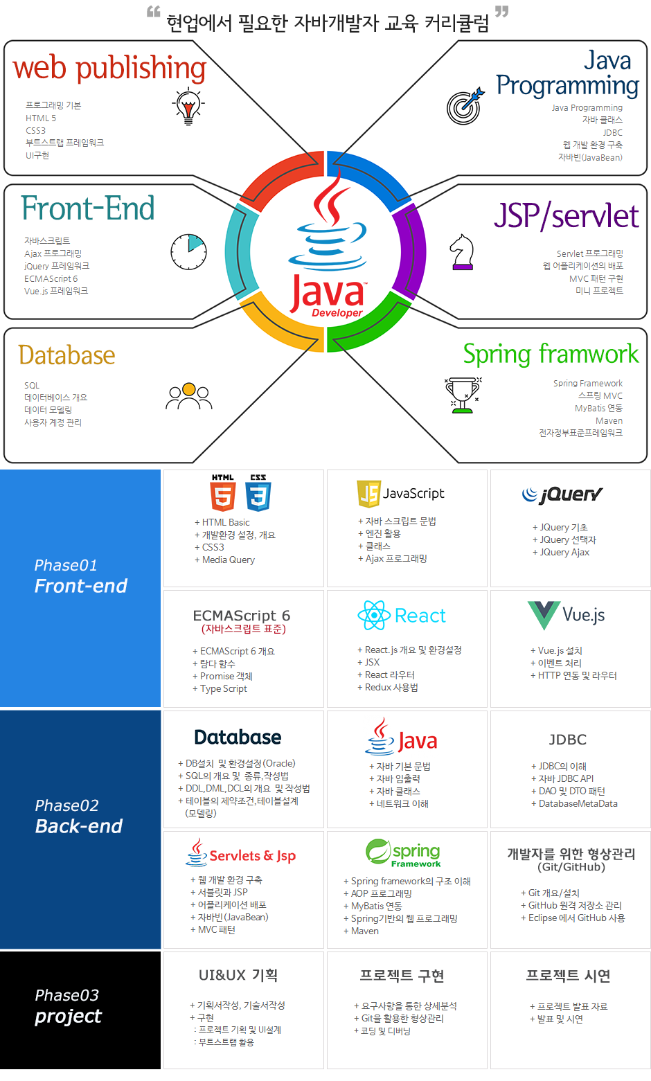 ○ 주요 과목 - Front-End: Html CSS / JavaScript - Back-End: Java / Servlets & JSP / Spring Framework&Boot / Python Django - 협약기업개발자특강 프로젝트